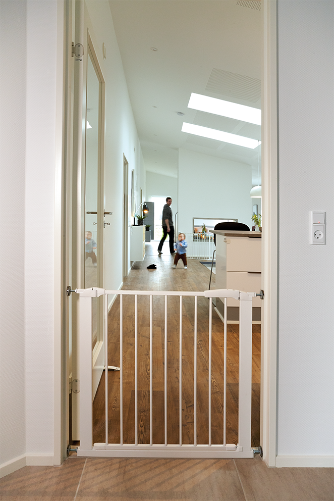 Ta nowoczesna bramka zabezpieczająca dopasowuje się do przejść o szerokości od 77,3 do 83,5 cm. Po zamontowaniu opcjonalnych rozszerzeń (dostępne oddzielne) można nią zabezpieczyć przejścia o szerokości nawet 110 cm.