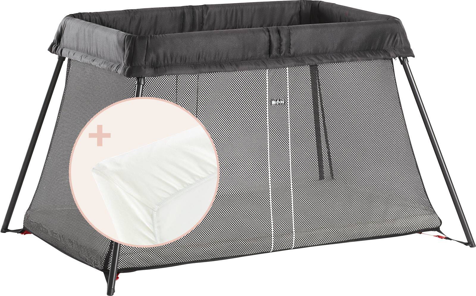 Wygodne i lekkie łóżeczko turystyczne BABYBJORN w zestawie z prześcieradłem do łóżeczka turystycznego LIGHT