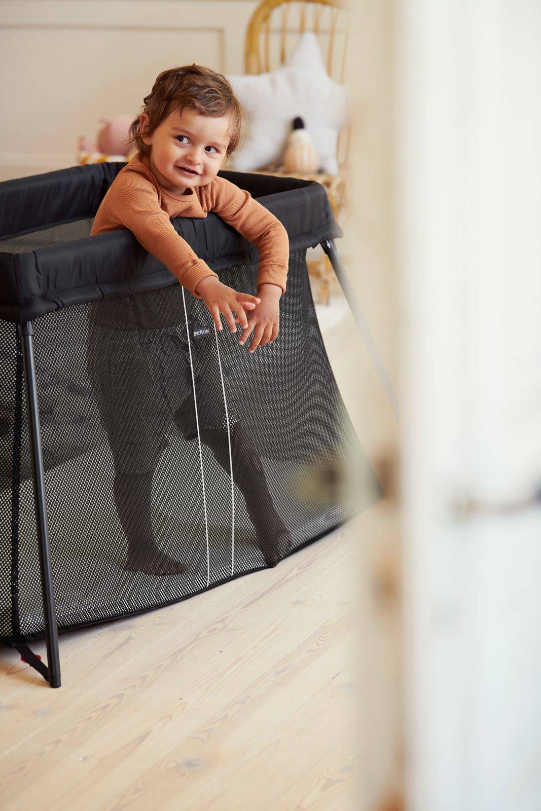Łóżeczko podróżne BABYBJÖRN, które można rozstawić jednym prostym ruchem. Nogi rozkładają się automatycznie, a po umieszczeniu materaca powstaje stabilne łóżeczko do korzystania w domu lub w podróży. Nieużywane, można równie szybko i łatwo złożyć. - Bezpieczne dla dziecka