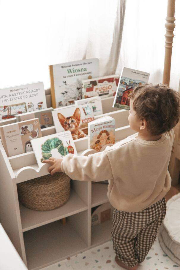 Zainspirowani filozofią Montessori, stworzyliśmy regał, który zachęca dzieci do czytania poprzez układanie książek okładkami do przodu, umożliwiając łatwy dostęp i wizualny kontakt z literaturą.