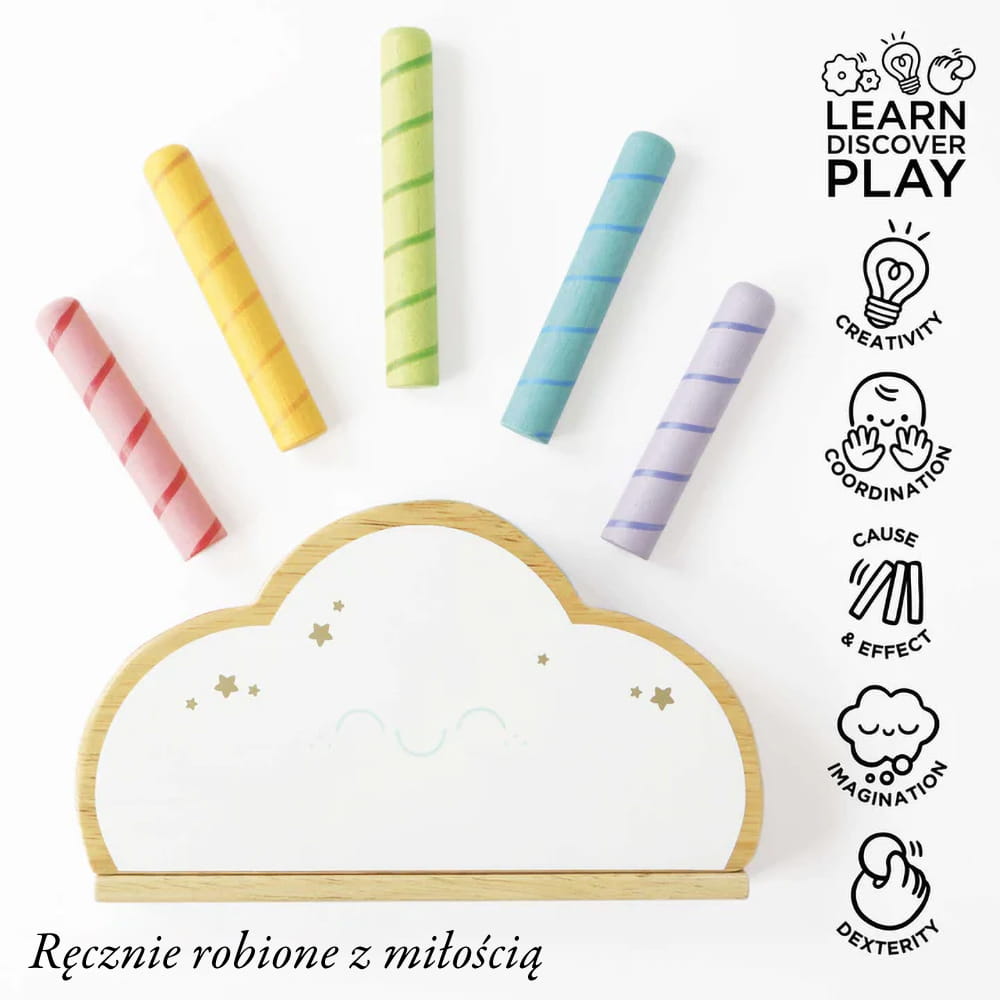 Ta gra w kształcie tęczowej chmurki to klasyczna zabawa. Małe dzieci pokochają interaktywną, sprężynową drewnianą zabawkę, która posiada pięć kolorowych tęczowych patyczków wyskakujących w trzech różnych wysokościach.