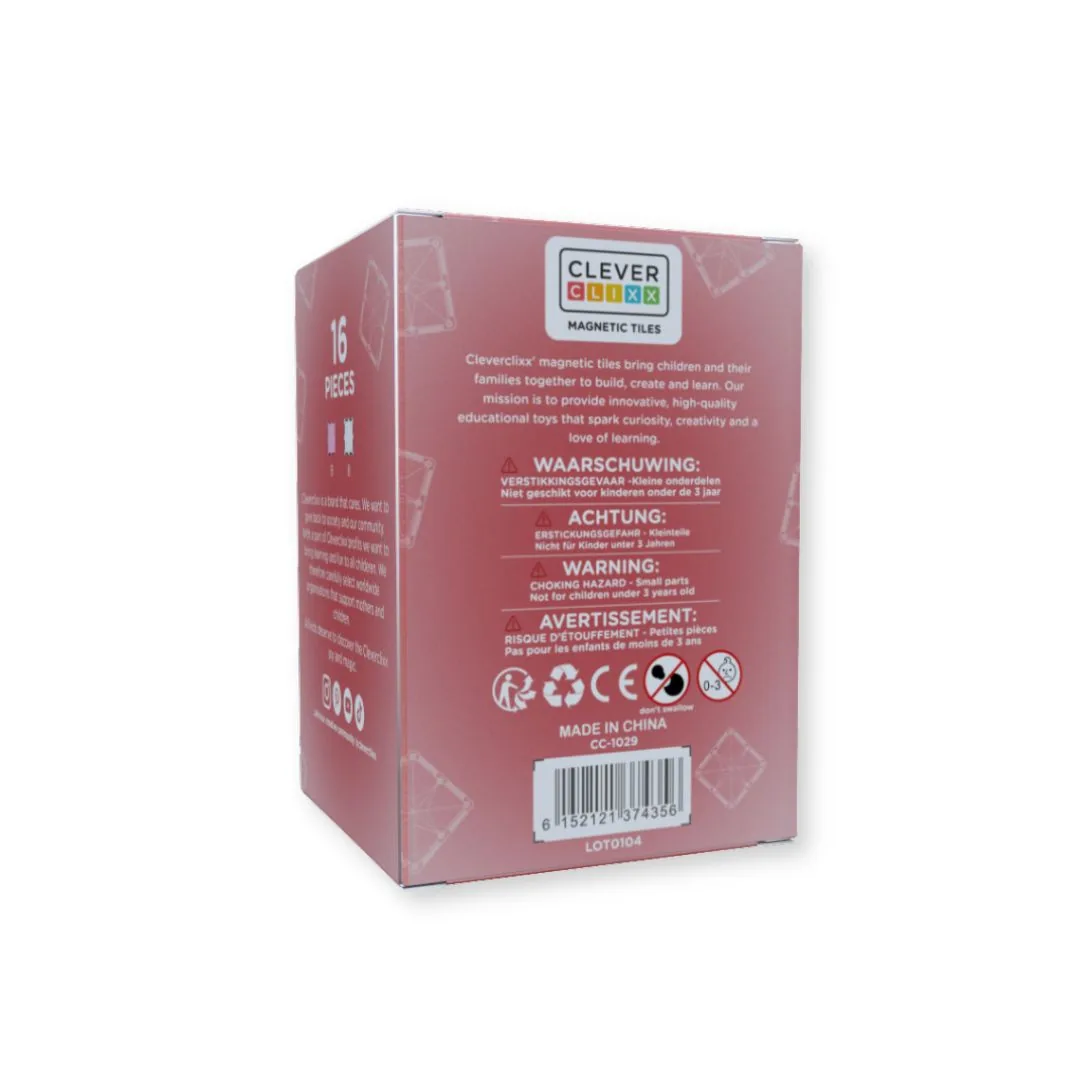 Cleverclixx Glitter Tiles to wyjątkowy zestaw 16 magnetycznych klocków w transparentnym, różowym kolorze z delikatnym brokatem. To nie tylko piękny akcent wizualny, ale też inspiracja do twórczej zabawy i nauki. Klocki wspierają rozwój wyobraźni, myślenia przestrzennego i motoryki – a dzięki kompatybilności z innymi zestawami Cleverclixx (oraz popularnymi markami płytek) możesz zbudować coś jeszcze większego i bardziej wyjątkowego.