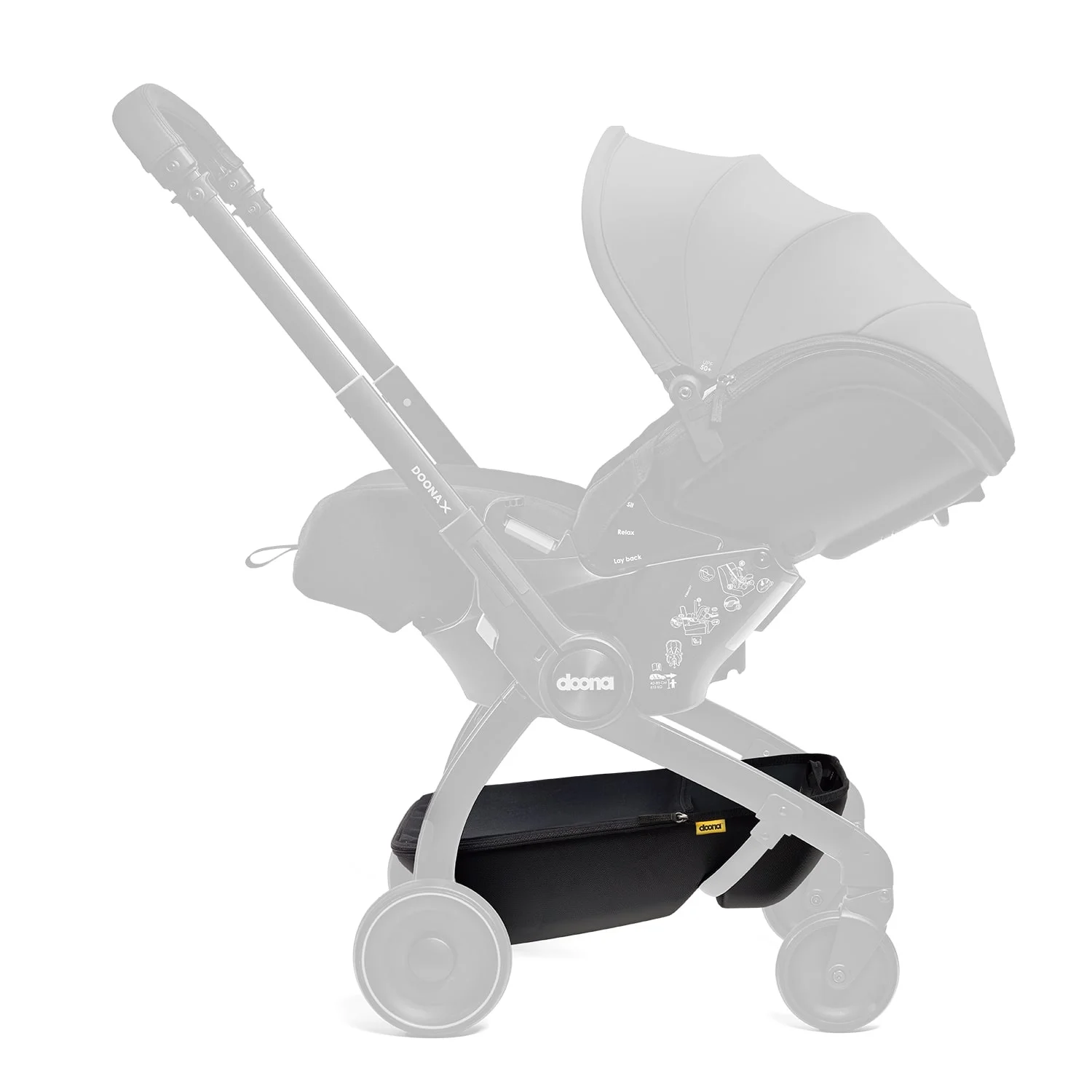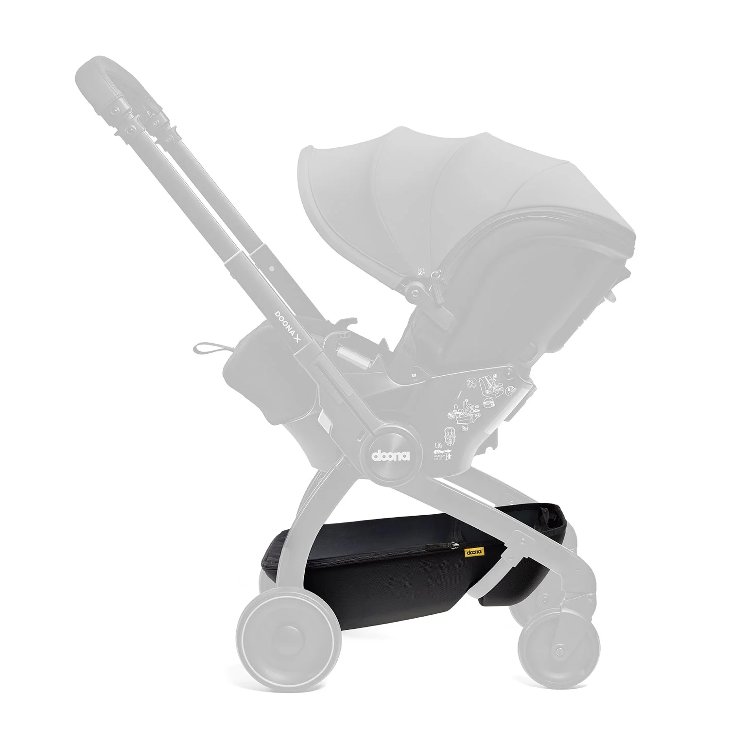 Specjalnie zaprojektowany kosz na zakupy, zapewnia dodatkowe miejsca do przechowywania podczas korzystania z Doona w trybie wózka.