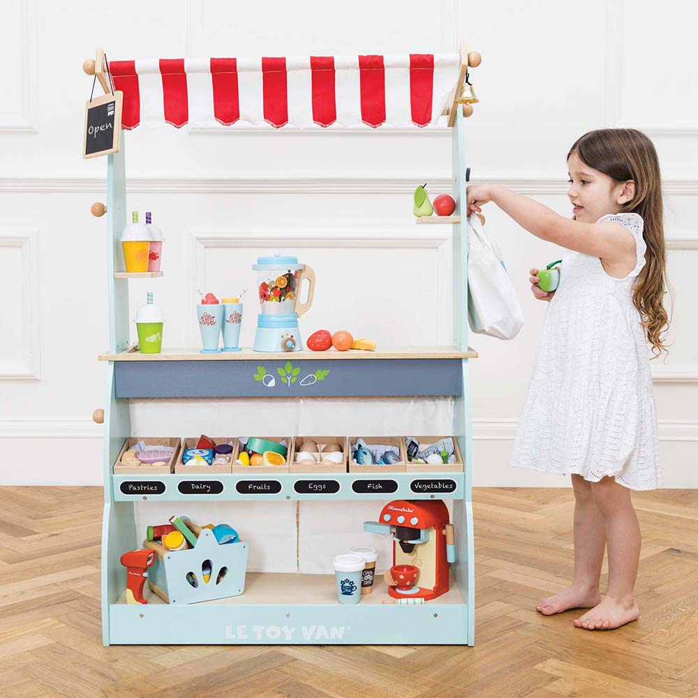 Maluchy pokochają obsługę klientów w kawiarni, a następnie wystarczy odwrócić ją, aby ujawnić stragan z półkami, idealnymi do przechowywania drewnianych skrzynek na żywność Le Toy Van.