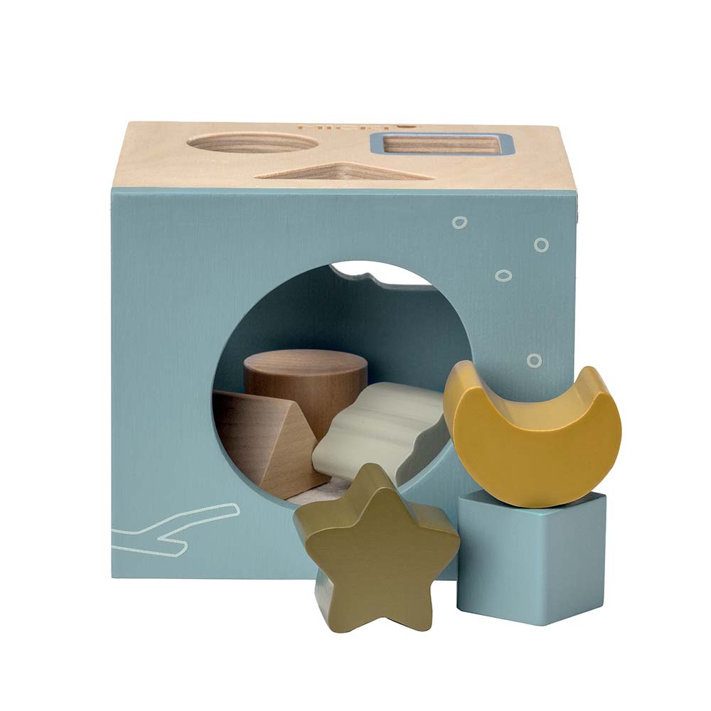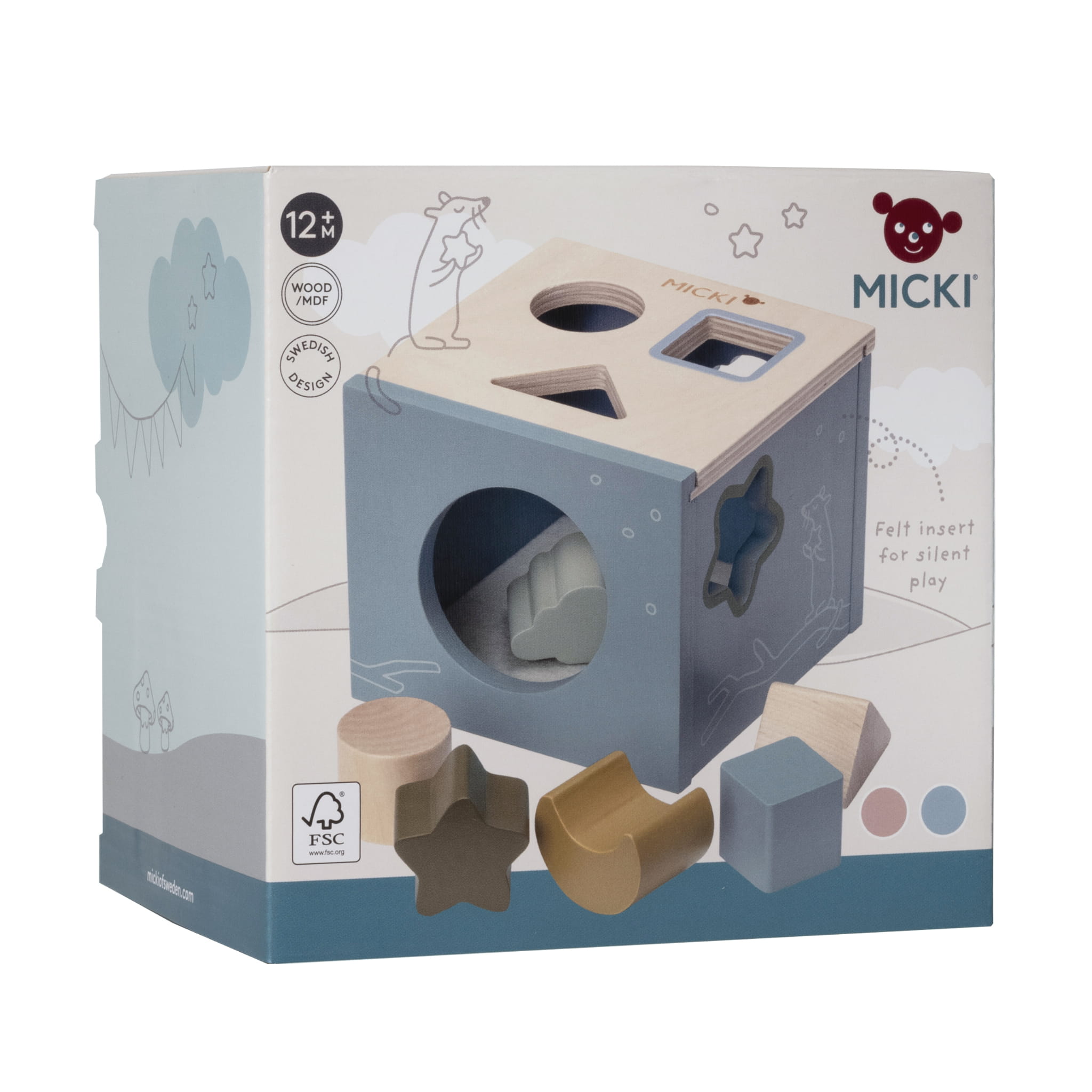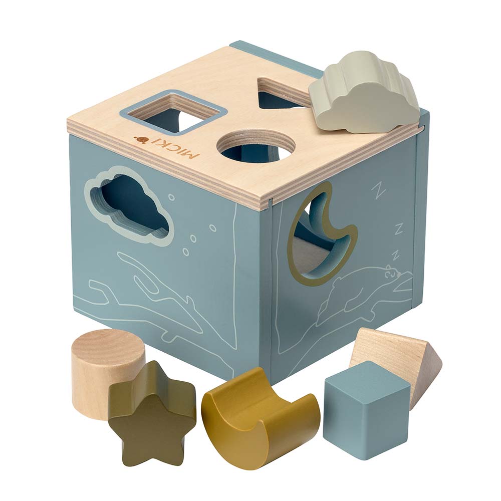 Odpowiedni kształt w odpowiednim otworze! Klasyczna drewniana zabawka Micki - sorter kształtów, inspiruje do nauki i zabawy. Otwory w drewnianej zabawce pasują do kształtu i koloru drewnianych klocków, więc dziecko wie, który klocek pasuje. Gdy klocki są w pudełku, wystarczy wsunąć rękę w otwór, aby je wyjąć i zacząć od nowa! Dno pudełka jest pokryte filcem, aby dawało przyjemny dźwięk, gdy klocki są wrzucane. Sorter kształtów zawiera sześć drewnianych klocków o różnych kształtach.