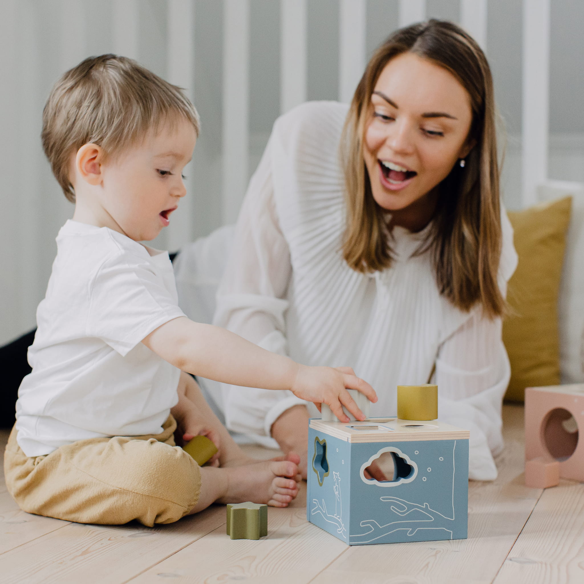Dźwięki: Dno skrzynki jest wyłożone miękką tkaniną, aby dźwięki, które wydają klocki podczas wrzucania, były bardziej przyjemne dla ucha dziecka. To dodatkowy element sensoryczny, który wzbogaca doświadczenie z zabawą.
