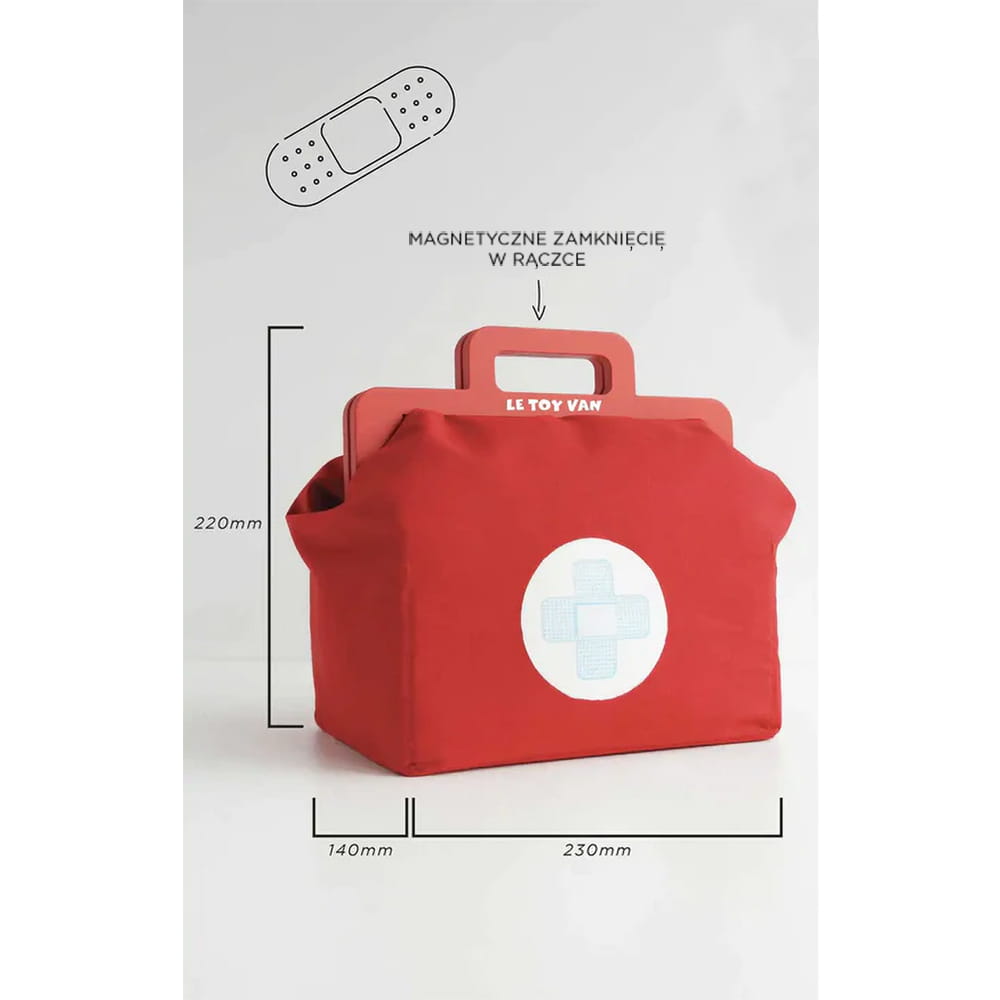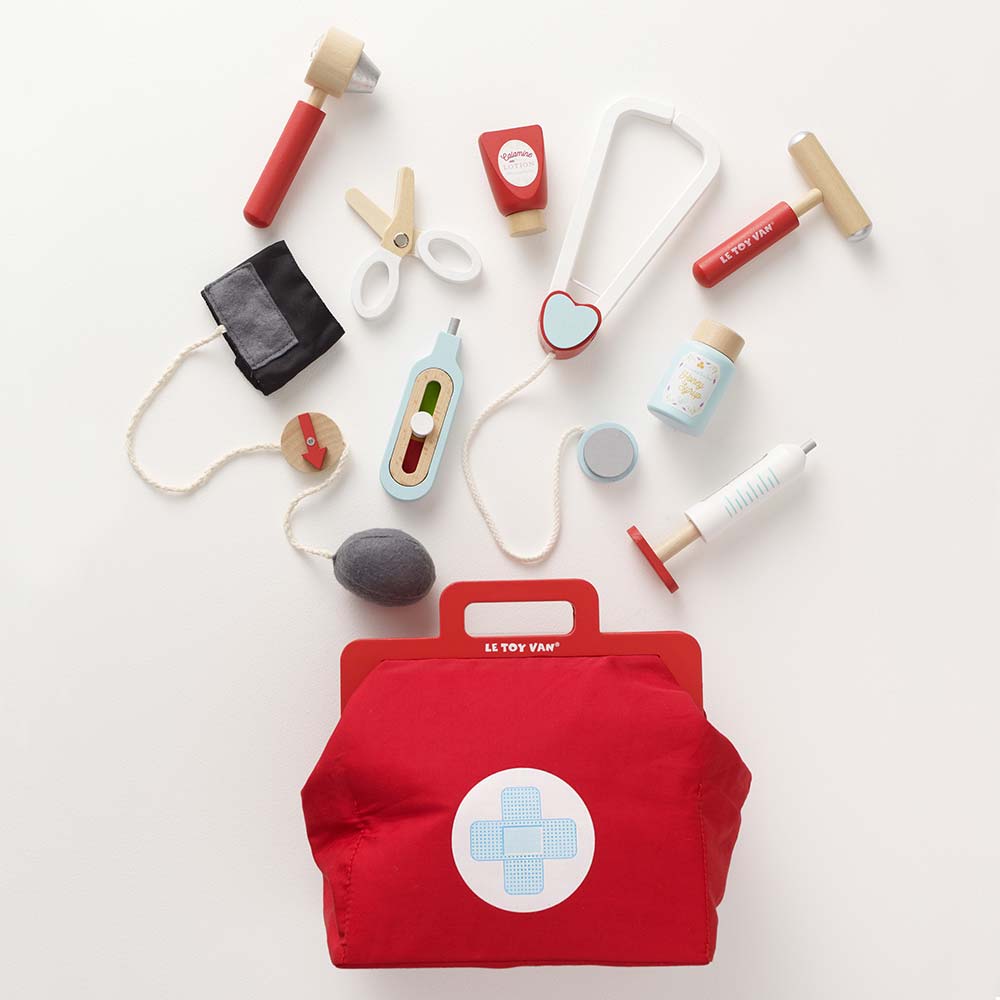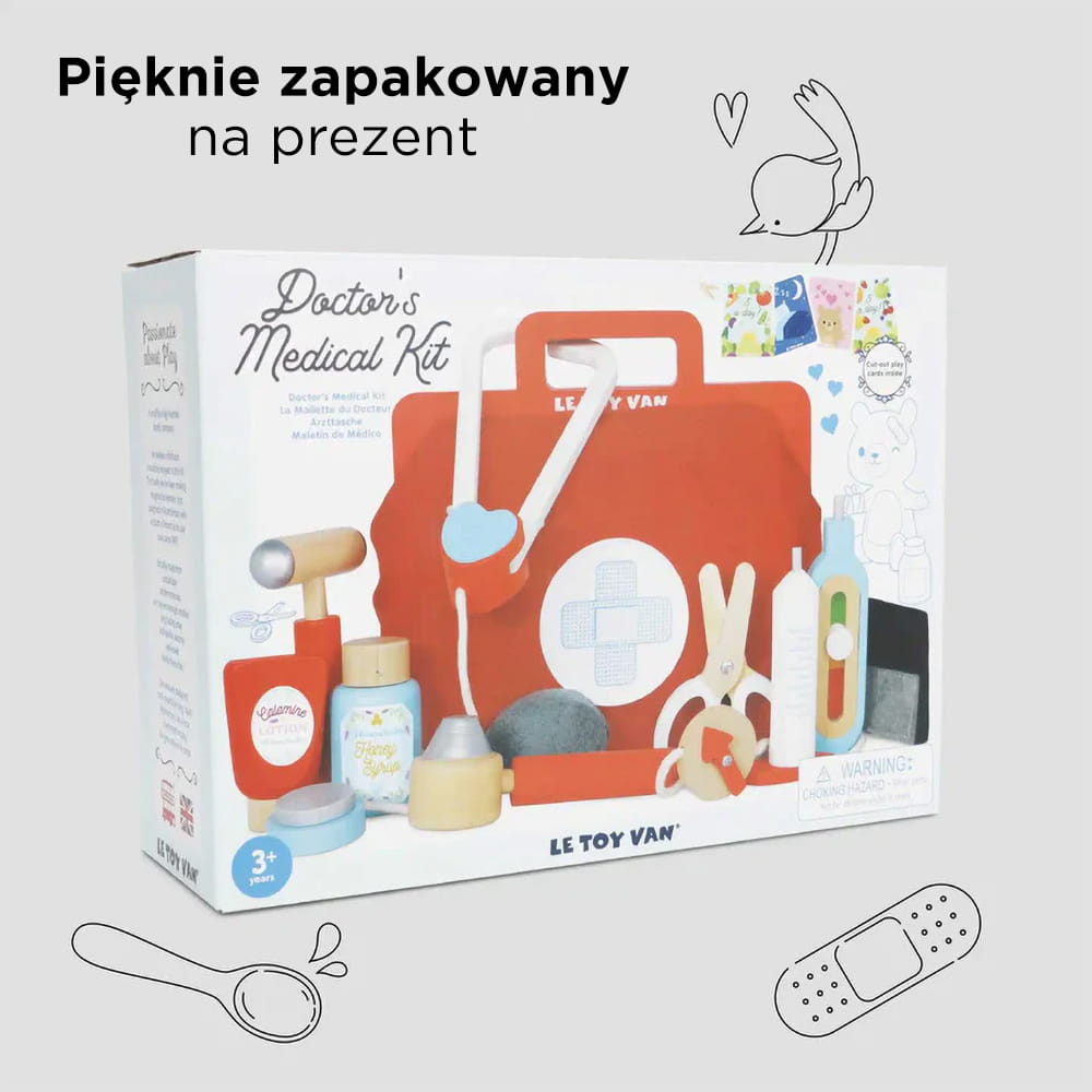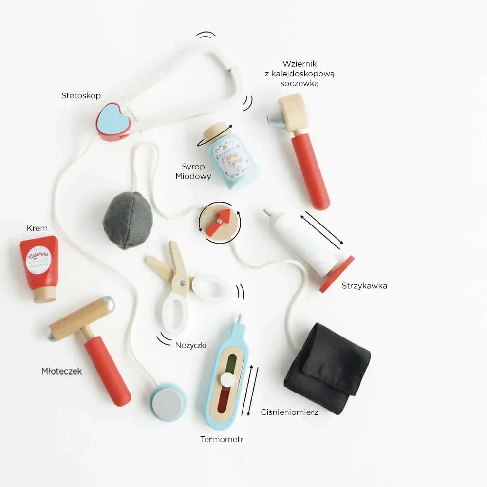 Zestaw obejmuje 9 kolorowych drewnianych akcesoriów do zabawy z unikalnymi cechami do odkrycia, w tym: stetoskop, termometr, strzykawkę, nożyce chirurgiczne, maść i inne. Zabawa w udawanie nigdy wcześniej nie była tak przyjemna!