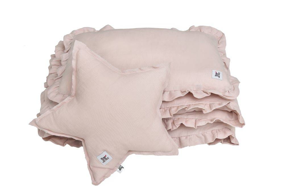Kolekcję lnianą tworzą: pościele i prześcieradła w różnych rozmiarach, ochraniacz, ozdobna poduszka w kształcie gwiazdki, wałek pod głowę, baldachim, eleganckie falbanki do łóżeczka oraz przewijak z dwustronnym podkładem.