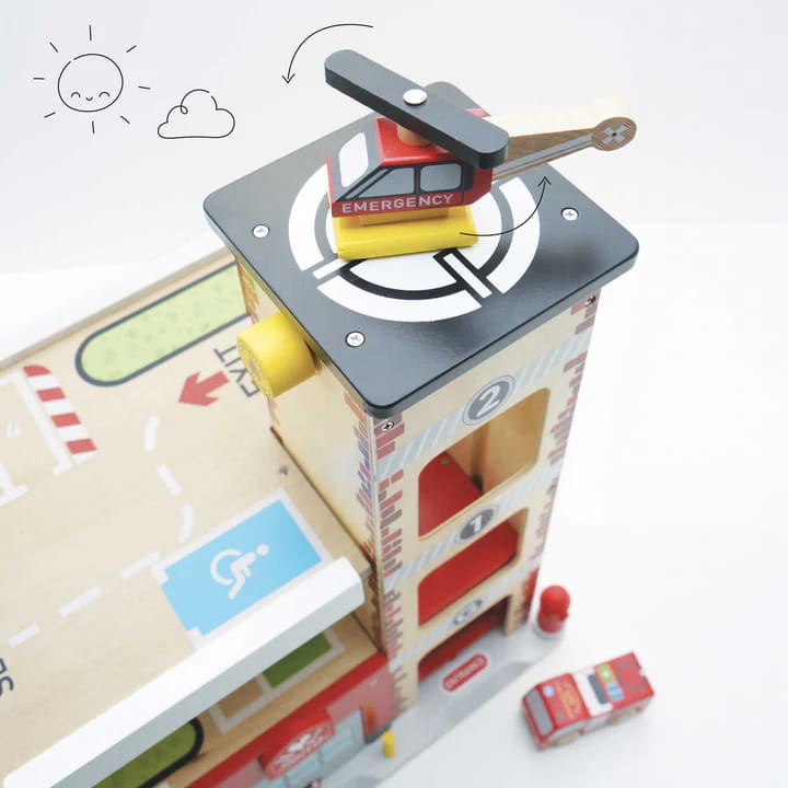 Zbudowany, aby wytrzymać godziny inspirującej zabawy. Maluchy z radością odkryją działający dzwonek, windę dla auta z mechanizmem nakręcania, rampy z kompozytu drewnianego, otwierane i zamykane drzwi awaryjne, lądowisko dla śmigłowca i miejsca parkingowe. To wspaniała zabawka do rozwijania wyobraźni podczas realistycznych zabaw.