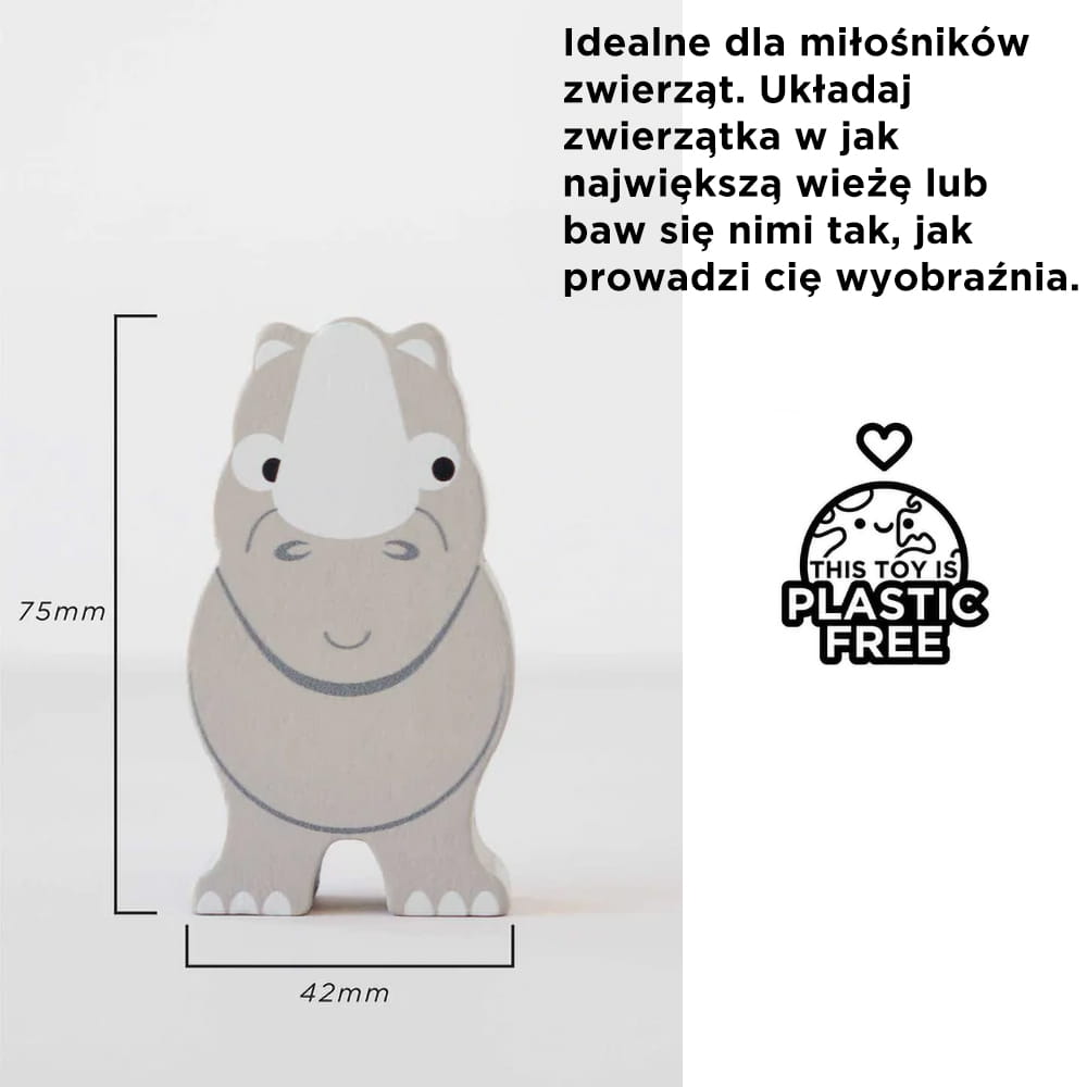 Pomalowany w kolorowych odcieniach za pomocą nietoksycznych farb, ten uroczy zestaw składa się z dziewięciu klocków w kształcie zwierzątek z litego drewna, idealnie dopasowanych do małych rączek. Zestaw zawiera: żyrafę, lwa, słonia, zebrę, małpkę, nosorożca, geparda, krokodyla, a nawet papugę.