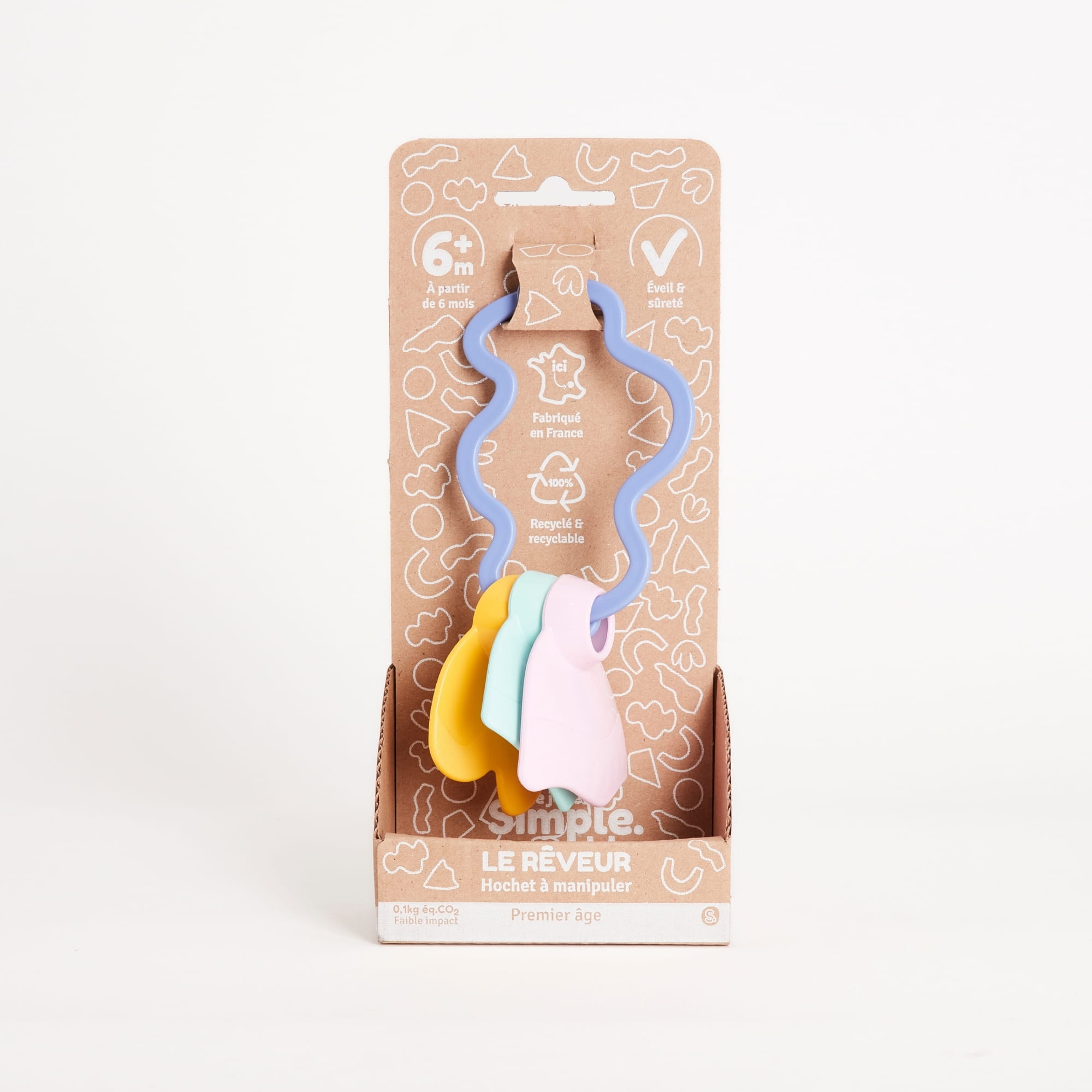 Grzechotka wykonana we Francji z plastiku z recyklingu. Grzechotka to jedna z pierwszych zabawek dzieci, która je uspokaja i zachęca do skupienia. Zabawa kształtami i zrozumienie, jak nimi manipulować, pomaga rozbudzić zmysły dzieci. Kolorowa grzechotka szybko stanie się ulubionym towarzyszem dziecka. Zabawka do manipulacji, gryzienia i potrząsania. Wiek: od 6 miesięcy. Cechy: Grzechotka w kształcie chmurki składająca się z 3 płetw o różnych kształtach, kolorach i teksturach. Bezpieczne zamknięcie dla bezpiecznej zabawy. Płetwy pasują do siebie, aby rozwijać umiejętności obserwacji. Różne tekstury stymulują dotyk i rozbudzają zmysł odkrywania. Projekt i kształt zaprojektowane dla rąk niemowląt. Możliwość mycia w zmywarce do 60°C.