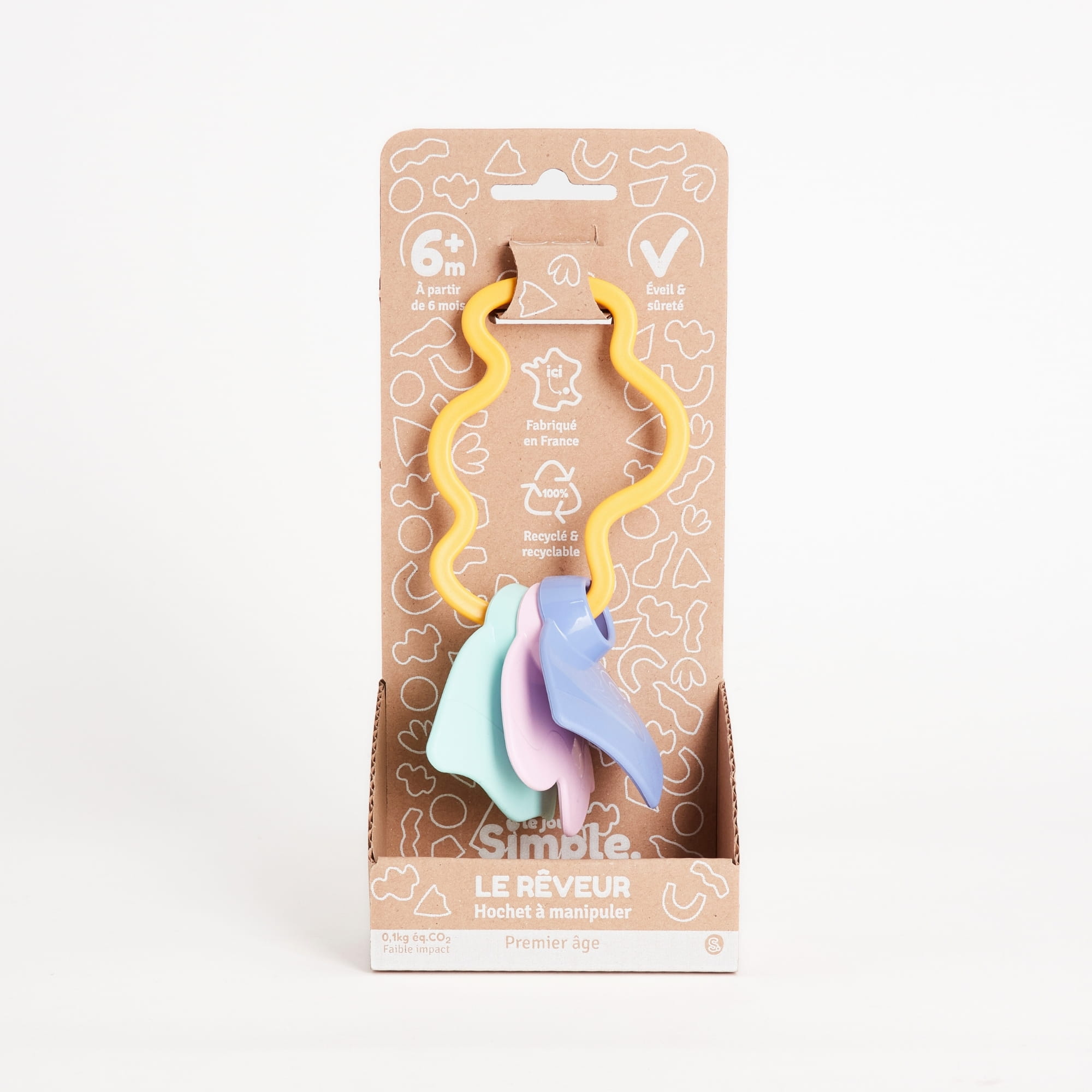 Grzechotka wykonana we Francji z plastiku z recyklingu. Grzechotka to jedna z pierwszych zabawek dzieci, która je uspokaja i zachęca do skupienia. Zabawa kształtami i zrozumienie, jak nimi manipulować, pomaga rozbudzić zmysły dzieci. Kolorowa grzechotka szybko stanie się ulubionym towarzyszem dziecka. Zabawka do manipulacji, gryzienia i potrząsania. Wiek: od 6 miesięcy. Cechy: Grzechotka w kształcie chmurki składająca się z 3 płetw o różnych kształtach, kolorach i teksturach. Bezpieczne zamknięcie dla bezpiecznej zabawy. Płetwy pasują do siebie, aby rozwijać umiejętności obserwacji. Różne tekstury stymulują dotyk i rozbudzają zmysł odkrywania. Projekt i kształt zaprojektowane dla rąk niemowląt. Możliwość mycia w zmywarce do 60°C.