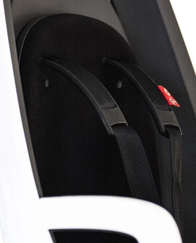 - Wgłębienie na kask zapobiegające wypchnięciu głowy dziecka do przodu.