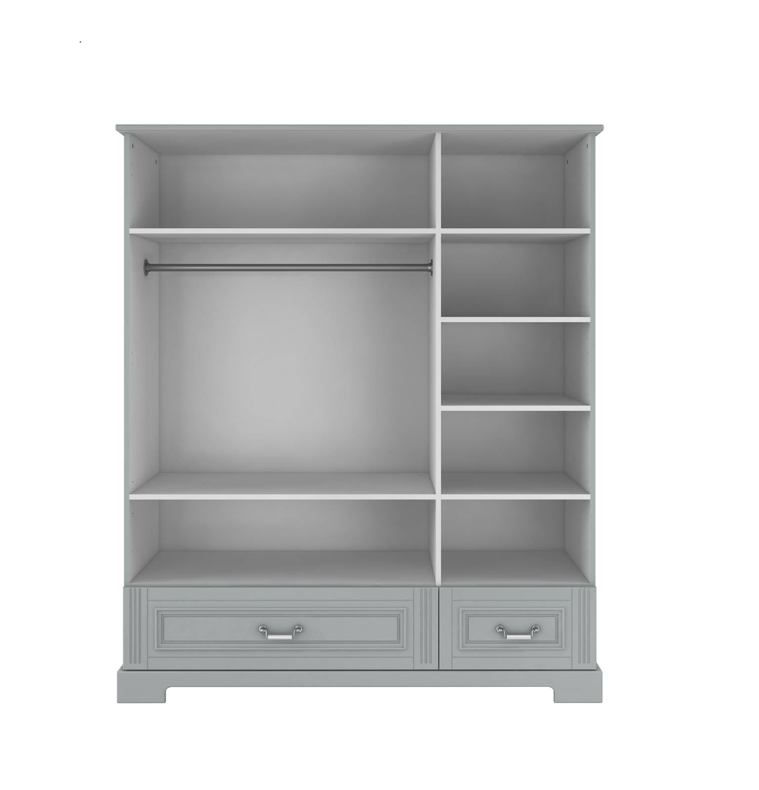 Szersza, dwudrzwiowa wyposażona jest w drążek wieszakowy oraz dwie pojemne półki (obejmujące całą szerokość tej części szafy).