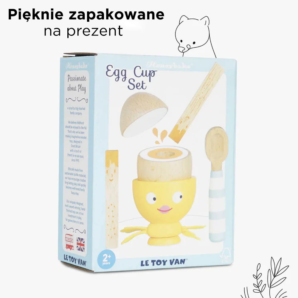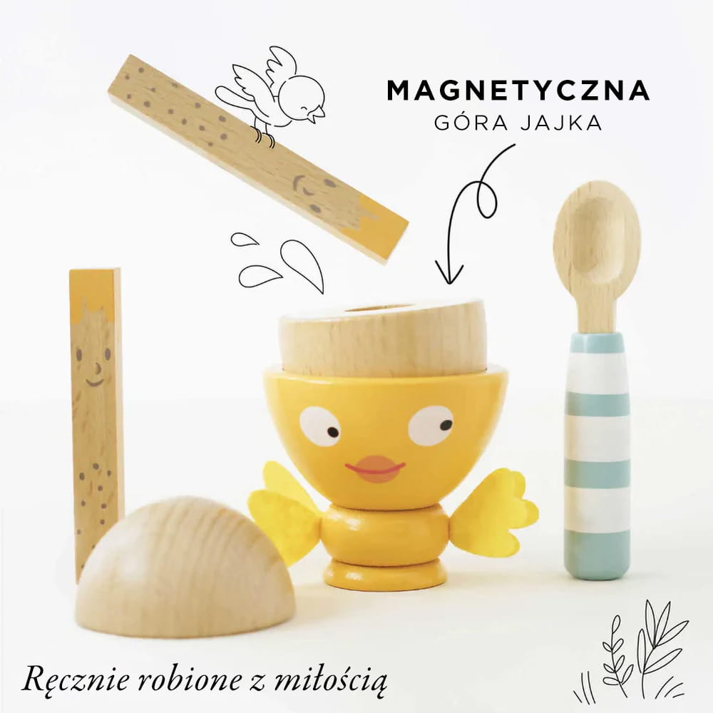 Śniadanie podane! Ten uroczy 6-elementowy zestaw z drewnianym kubeczkiem na jajka jest produkowany w sposób zrównoważony przez wykwalifikowanych rzemieślników, którzy używają solidnego drewna i wykańczają go nietoksycznymi farbami na bazie wody zapewniając bezpieczną zabawę dzień po dniu.