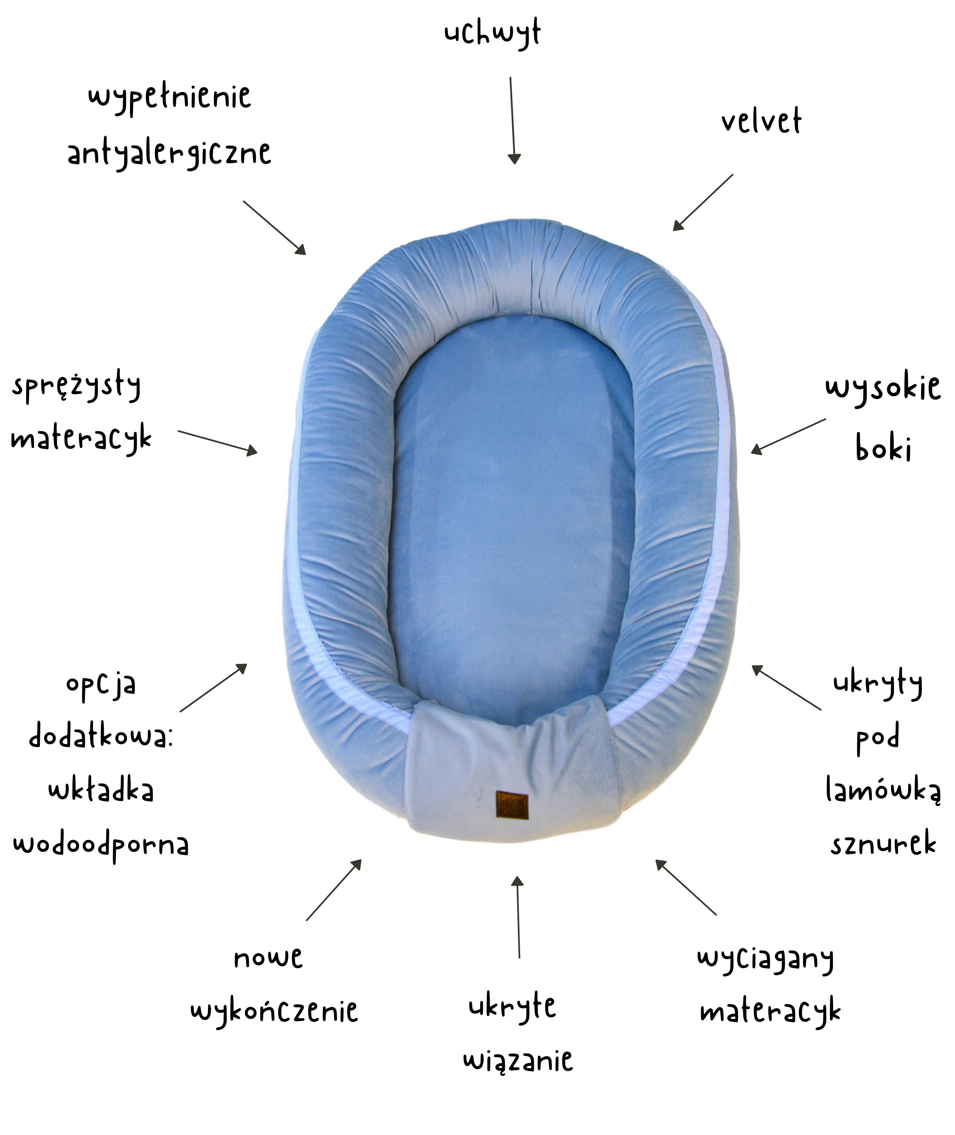 Każdy kokon niemowlęcy jest wykonany z wysokogatunkowych tkanin i estetycznie wykończony w naszej szwalni. Nie posiada luźnych elementów, które mogłyby być groźne dla dziecka.
