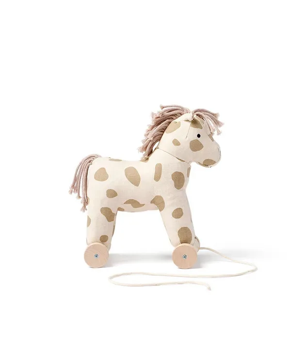 Dotty to uroczy koń na sznurku wykonany z trwałego płótna bawełnianego w kropki. Miękka grzywa i ogon z włóczki czynią go idealnym zarówno do aktywnej zabawy, jak i przytulania. Sznurek ułatwia prowadzenie konika podczas spacerów, wspierając rozwój równowagi i koordynacji. Po zdjęciu kółek Dotty zamienia się w miękką przytulankę na spokojniejsze chwile lub zabawę w udawanie. Jej kompaktowy rozmiar sprawia, że łatwo zabrać ją w podróż lub ustawić na półce, gdy zabawa się skończy.