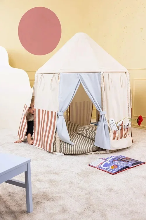 Namiot Muminków wykonany jest z wytrzymałego płótna z certyfikowanej bawełny i drewnianych słupków z certyfikatem FSC. Drzwi mogą być „zawsze otwarte” dzięki uchwytom na zasłony po obu stronach drzwi. Na książki i zabawki, które chcesz zabrać do namiotu, znajdują się dwie wewnętrzne kieszenie. Na zewnątrz znajduje się mniejsza kieszeń, w której znajdziesz trzy małe tekstylne figurki Muminków: Mamma Muminka, Mała Mi i Sniff.