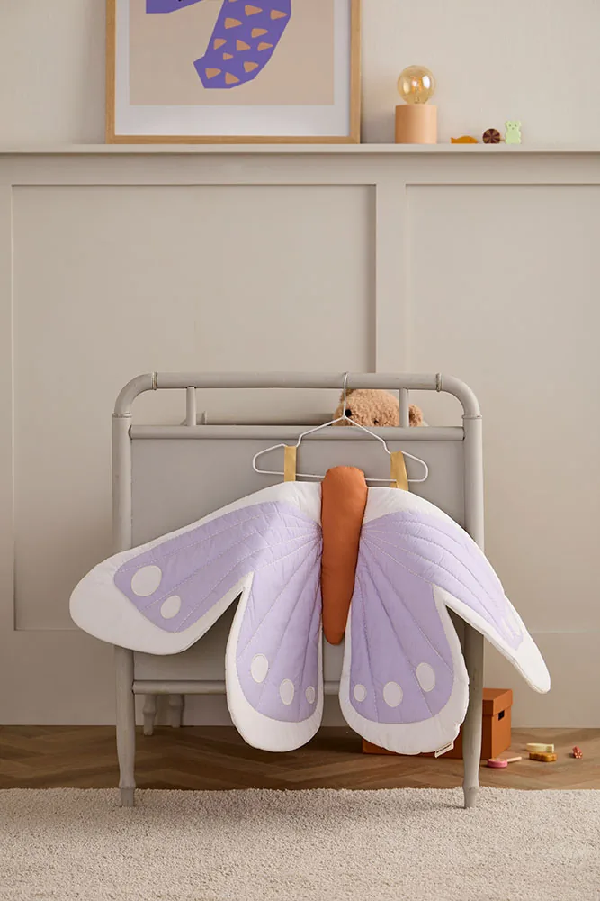 Skrzydła mają delikatne odcienie bieli i liliowego fioletu z miękkim, brązowym tułowiem pośrodku. Wypełnienie z recyklingowanego poliestru nadaje im lekkości i sprężystości, a haftowane detale dodają elegancji i struktury. Wykonane z materiałów certyfikowanych OEKO-TEX.