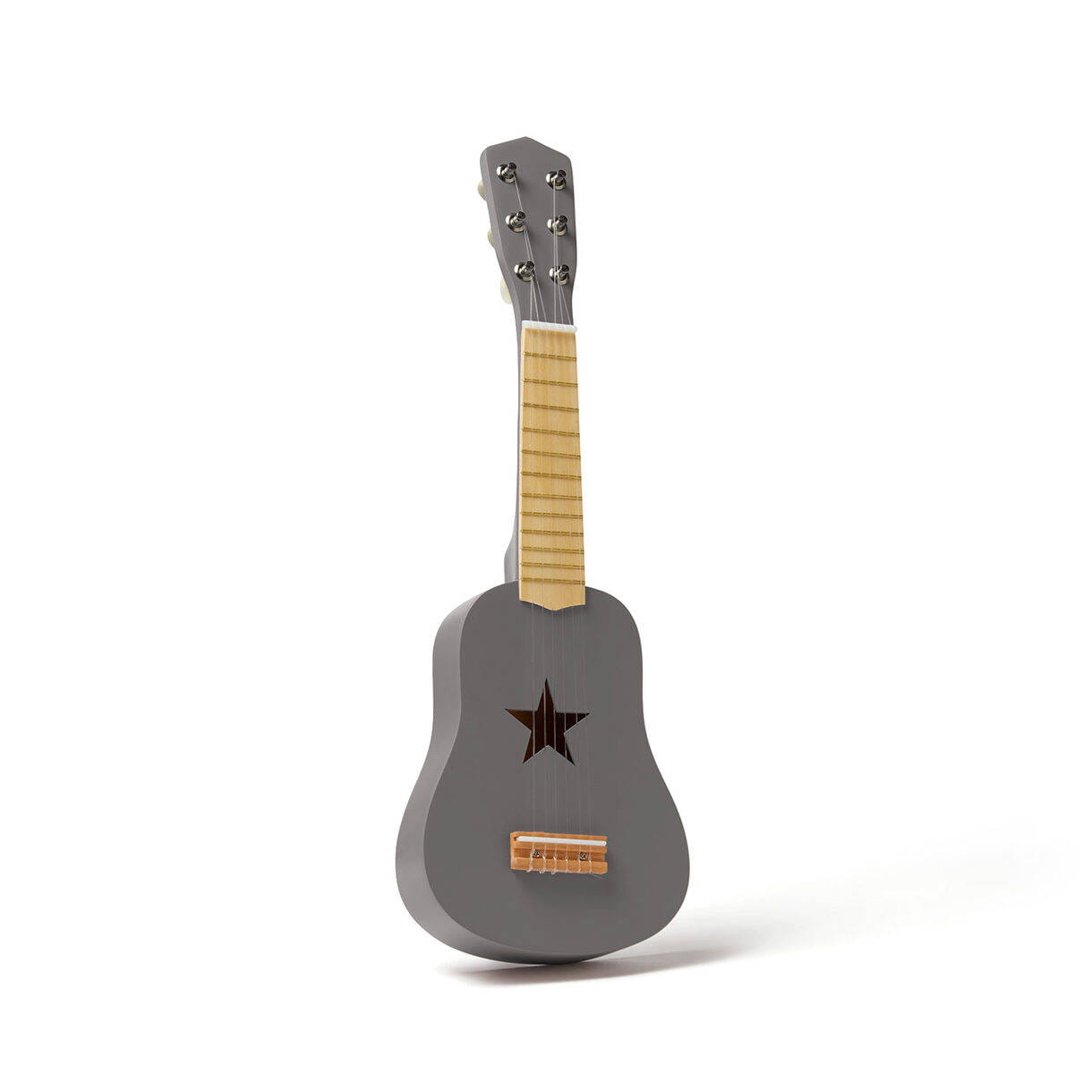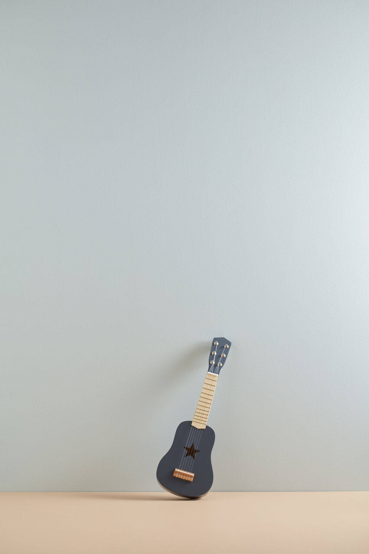 Drewniana gitara zabawkowa z wycięciem w kształcie gwiazdy.