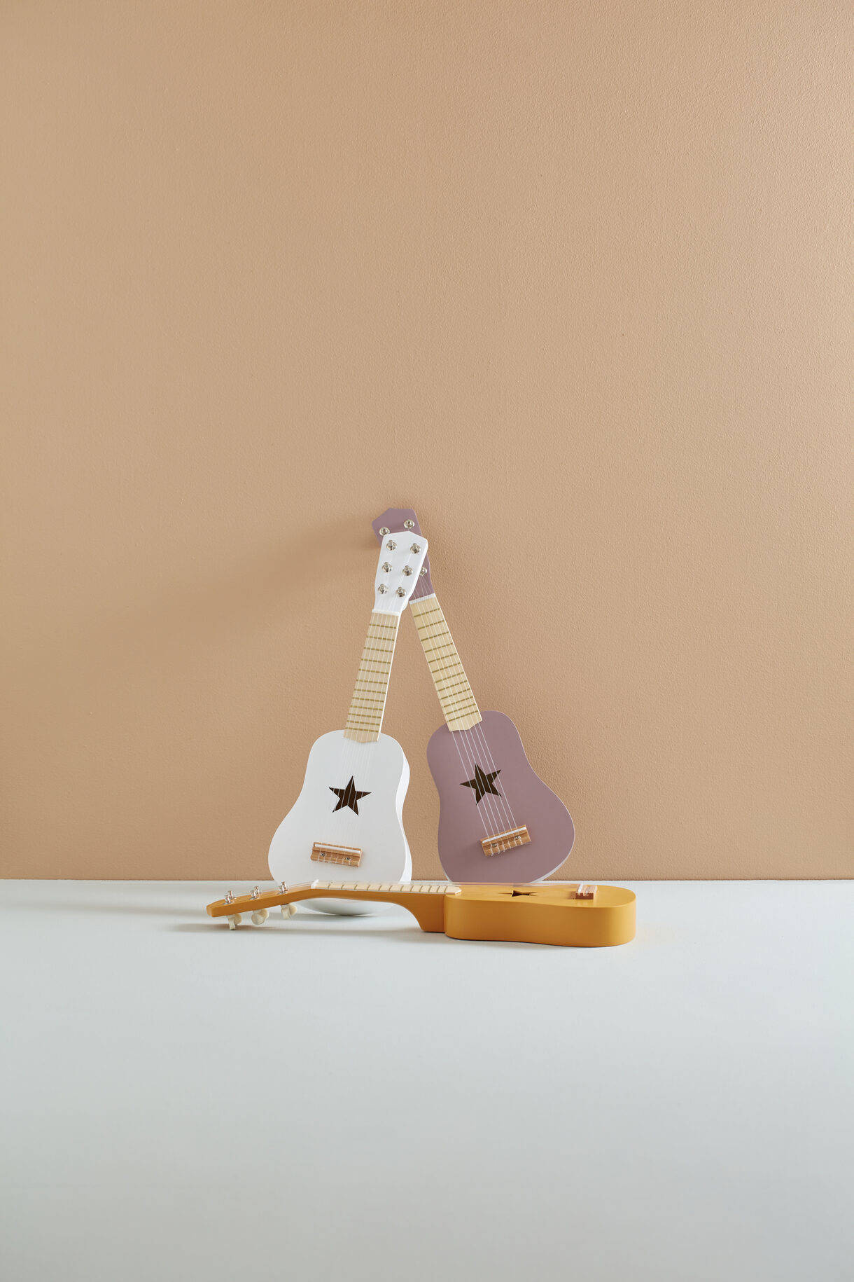 Drewniana gitara zabawkowa z wycięciem w kształcie gwiazdy.