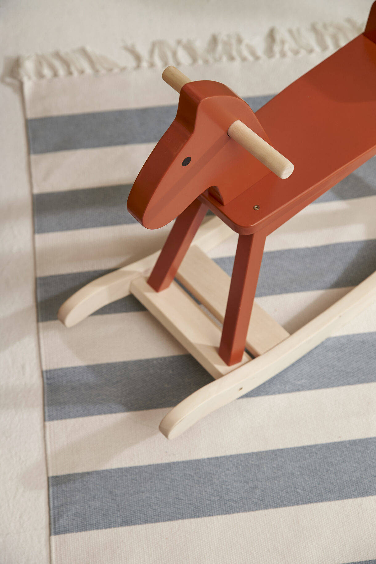 Konik na biegunach z naszej kolekcji Carl Larsson, wykonany z drewna z certyfikatem FSC. Posiada solidne uchwyty i bieguny zapobiegające przewróceniu. To klasyczny, ale wciąż nowoczesny koń na biegunach, którego projekt nawiązuje do stylu Karin. Modernistyczny i prosty, z charakterem. Tekstylia z domu Karin podsunęły nam pomysł na przywiązanie ogona konika do dziurki za siedziskiem. Karin często w ten sposób wiązała pompony i frędzle na obrusach. Kwadratowy przekrój nóg i sam kolor to z kolei nawiązanie do modernistycznego fotela bujanego Karin. Wiele mebli w jej jadalni ma ten fantastyczny czerwono-pomarańczowy odcień.