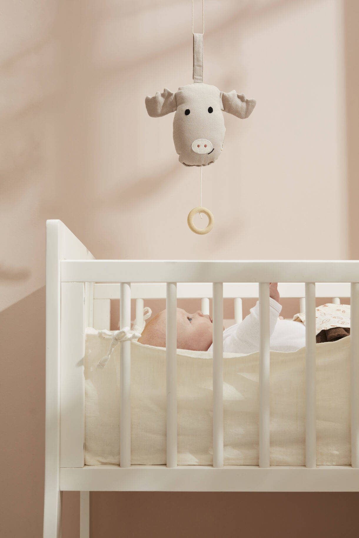 Pociągnij za drewniany uchwyt, a łoś Bo zagra uspokajającą melodię dla Twojego dziecka. Słuchanie tej samej melodii sprawia, że maluszek czuje się bezpieczny. Dzięki wieszaczkowi z rzepem możesz zabrać i zawiesić pozytywkę, gdzie tylko chcesz. Zabaw swojego maluszka w trakcie przewijania. Pozytywkę należy czyścić wilgotną szmatką lub odkurzając tkaninę. Ponieważ pozytywka zawiera elementy mechaniczne, zabawki nie można prać w pralce ani zamoczyć.