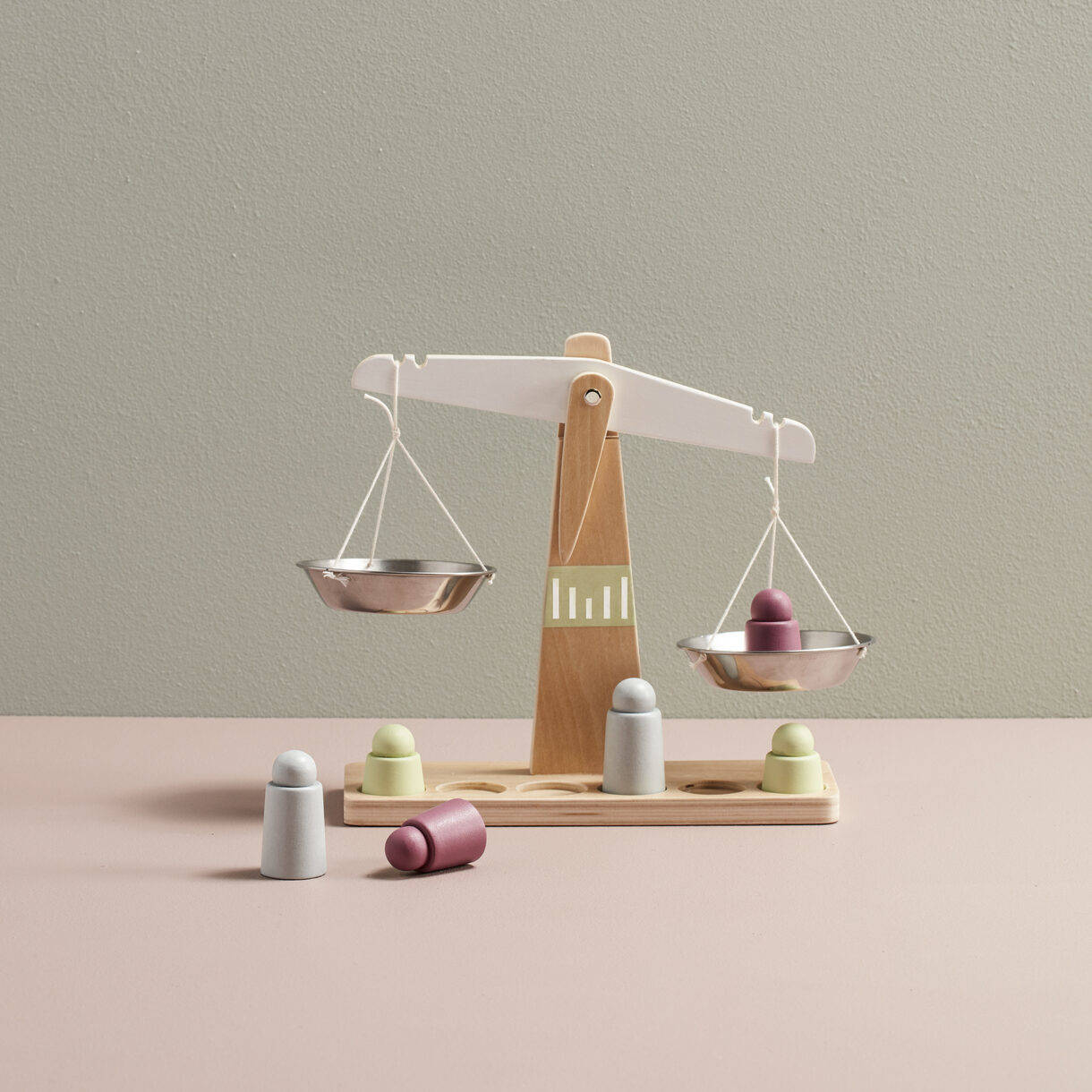 - Materiał Skala: sklejka. Odważniki: schima. Szalki: stal nierdzewna. Sznurek: bawełna.