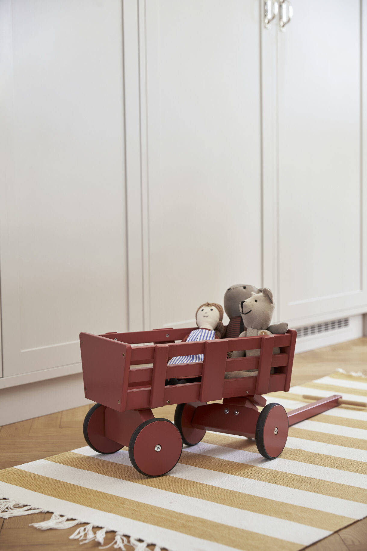 Wózek jest przeznaczony do zabawy w pomieszczeniach, a jego koła są pokryte gumą. Przednie kółka są obrotowe. Wózkiem można sterować za pomocą drewnianego drążka. Dla dziecka w wieku 3-6 lat to zabawny sposób przewożenia lalek.