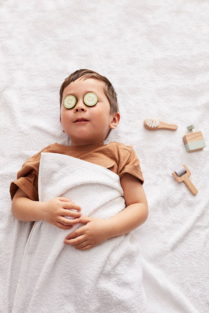 Ten luksusowy zestaw spa dla dzieci zawiera wszystko, czego potrzebujesz, by się rozluźnić i uspokoić na chwilę. Drewniana butelka z pompką ma wbudowaną małą sprężynkę, dzięki temu przypomina prawdziwą butelkę z kosmetykiem. Zestaw zawiera również miskę do mieszania i małą łyżeczkę, niezbędne do przygotowania peelingu lub maski do ciała. I co to byłoby za spa bez plasterków ogórka i uroczej maseczki?