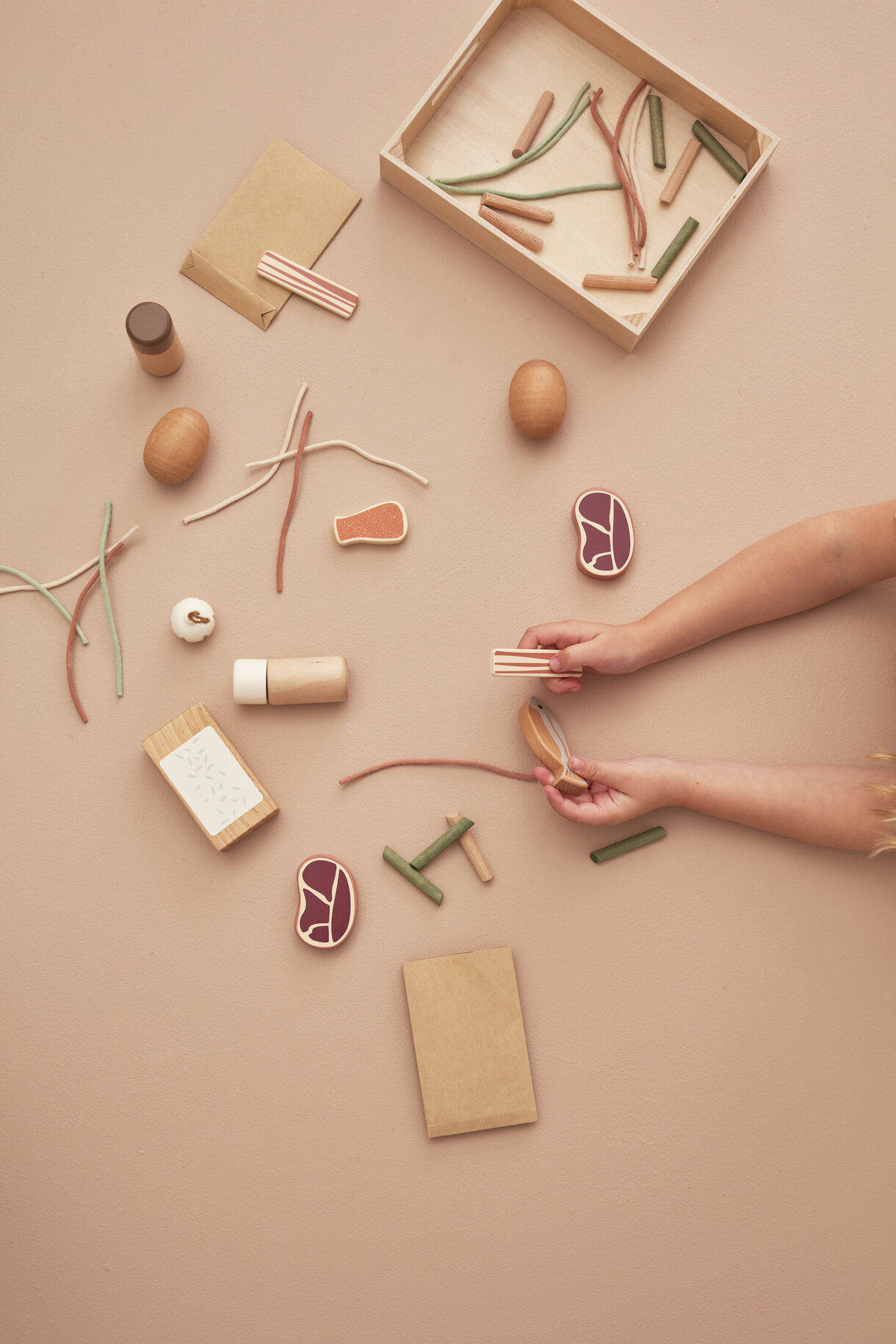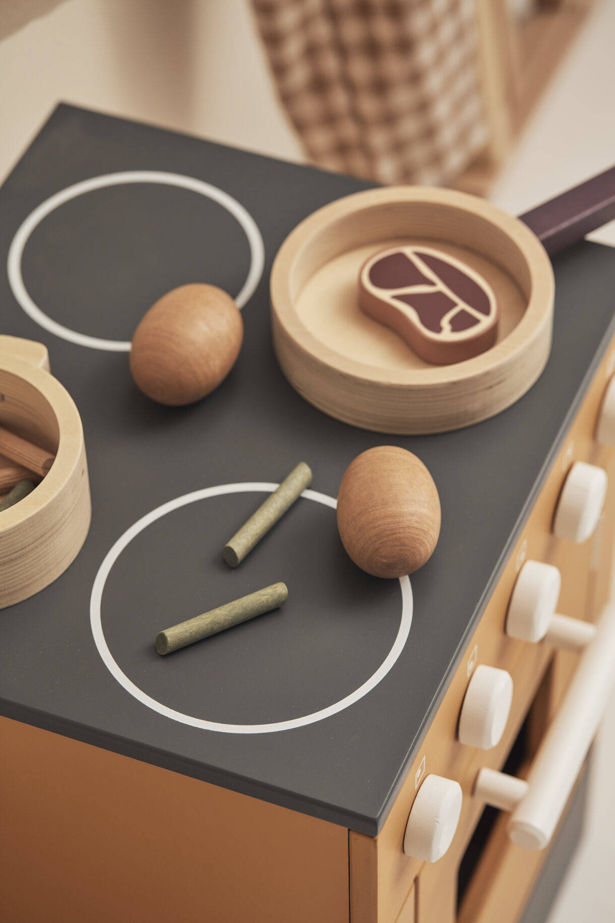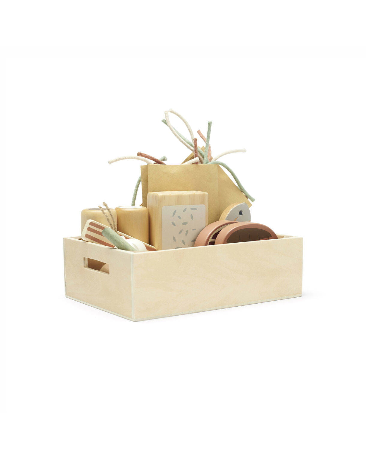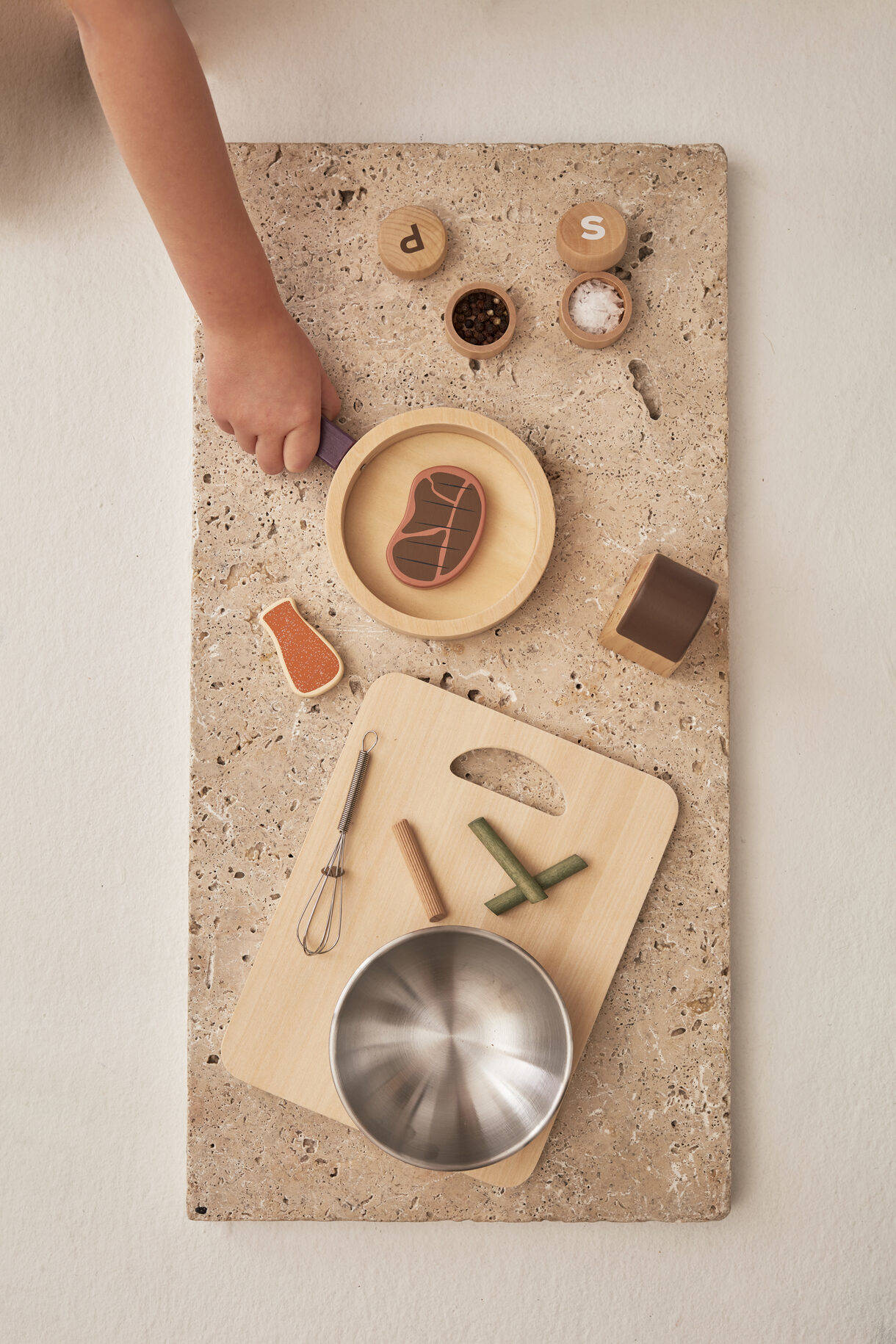 W zestawie znajdują się również solniczka i pieprzniczka, które po przekręceniu klikają. Makaron lub inne jedzenie do zabawy można przechowywać w dwóch dołączonych papierowych torebkach. Wszystkie akcesoria znajdują się w drewnianym pudełku.