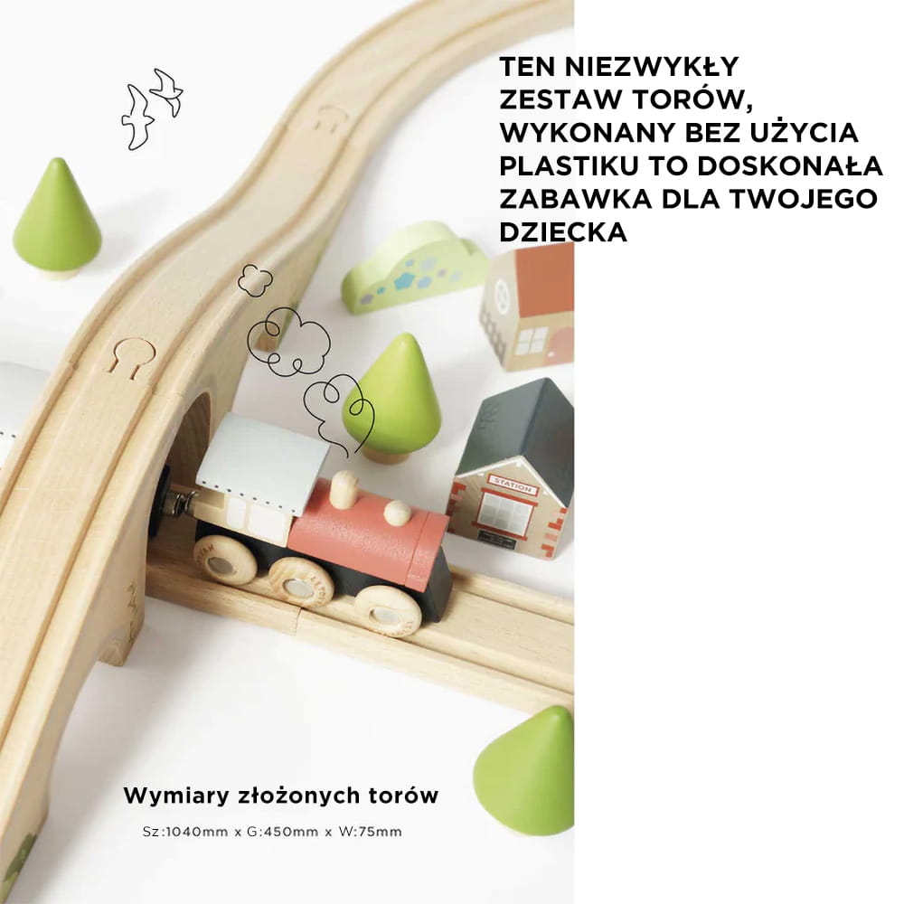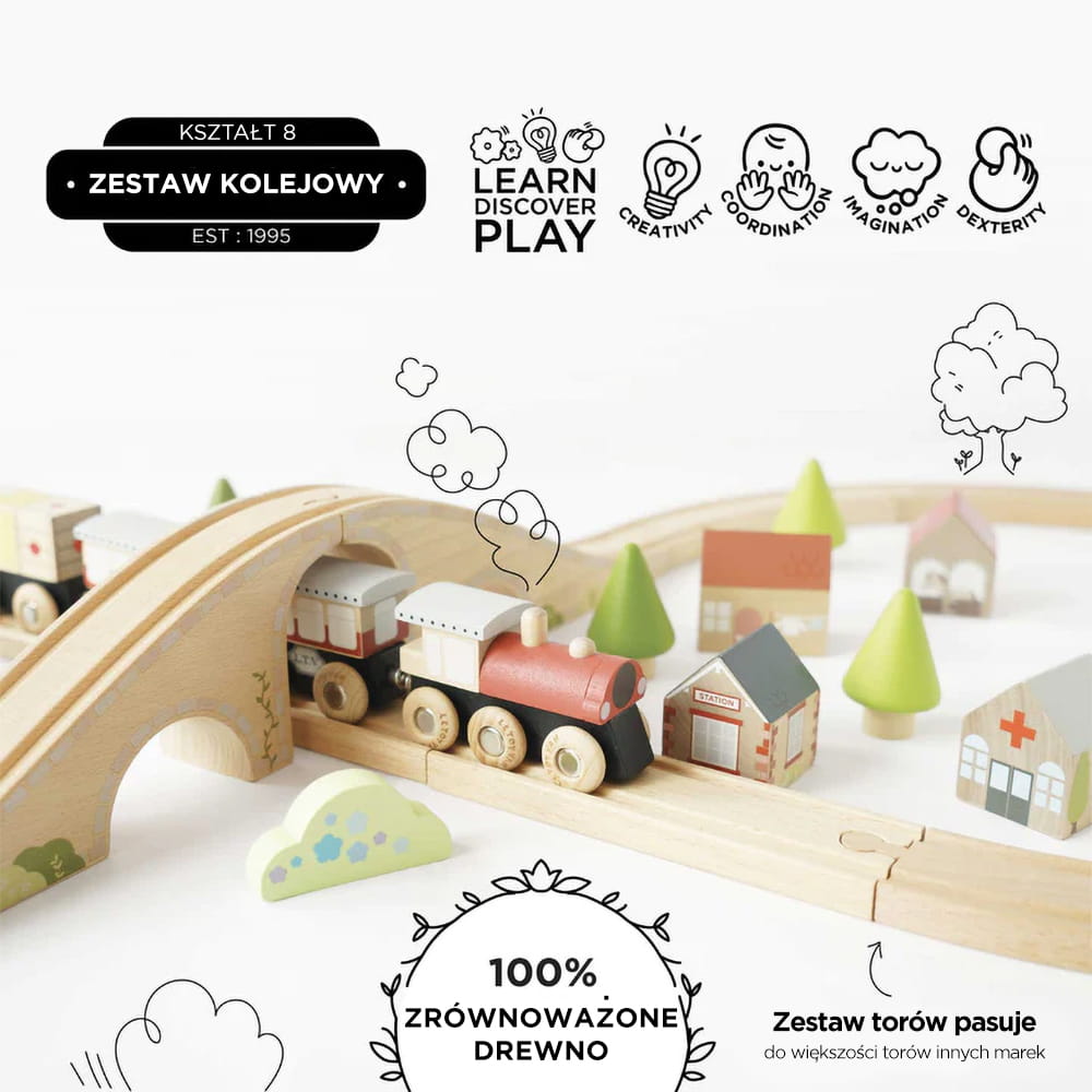 Wykonany z drewna certyfikowanego przez FSC®, ten 40-elementowy zestaw obejmuje tor w kształcie ósemki, trzy łuki mostów i wiele aktywności inspirujących do zabaw rolowych. Drewniane wagoniki są magnetyczne i łączą się, tworząc dłuższy pociąg. Zestaw obejmuje również szczegółowo wykonane budynki, stację, domki, rynek, szpital i farmę, namioty oraz drewniane drzewa i krzewy, dodając jeszcze więcej możliwości realistycznej zabawy.
