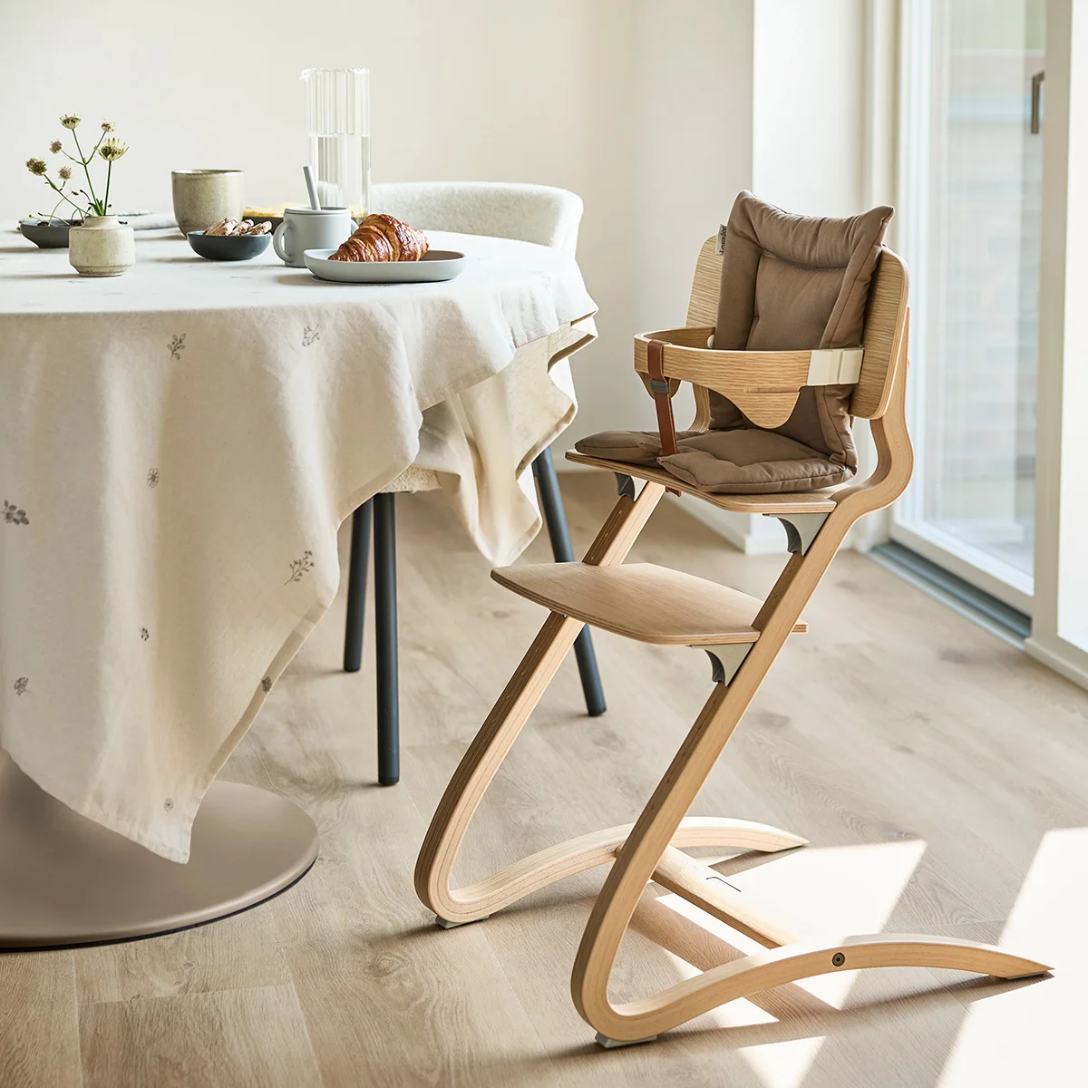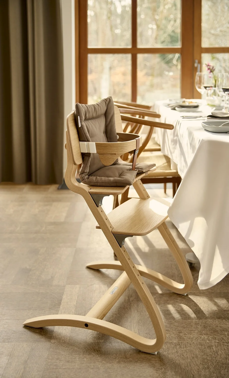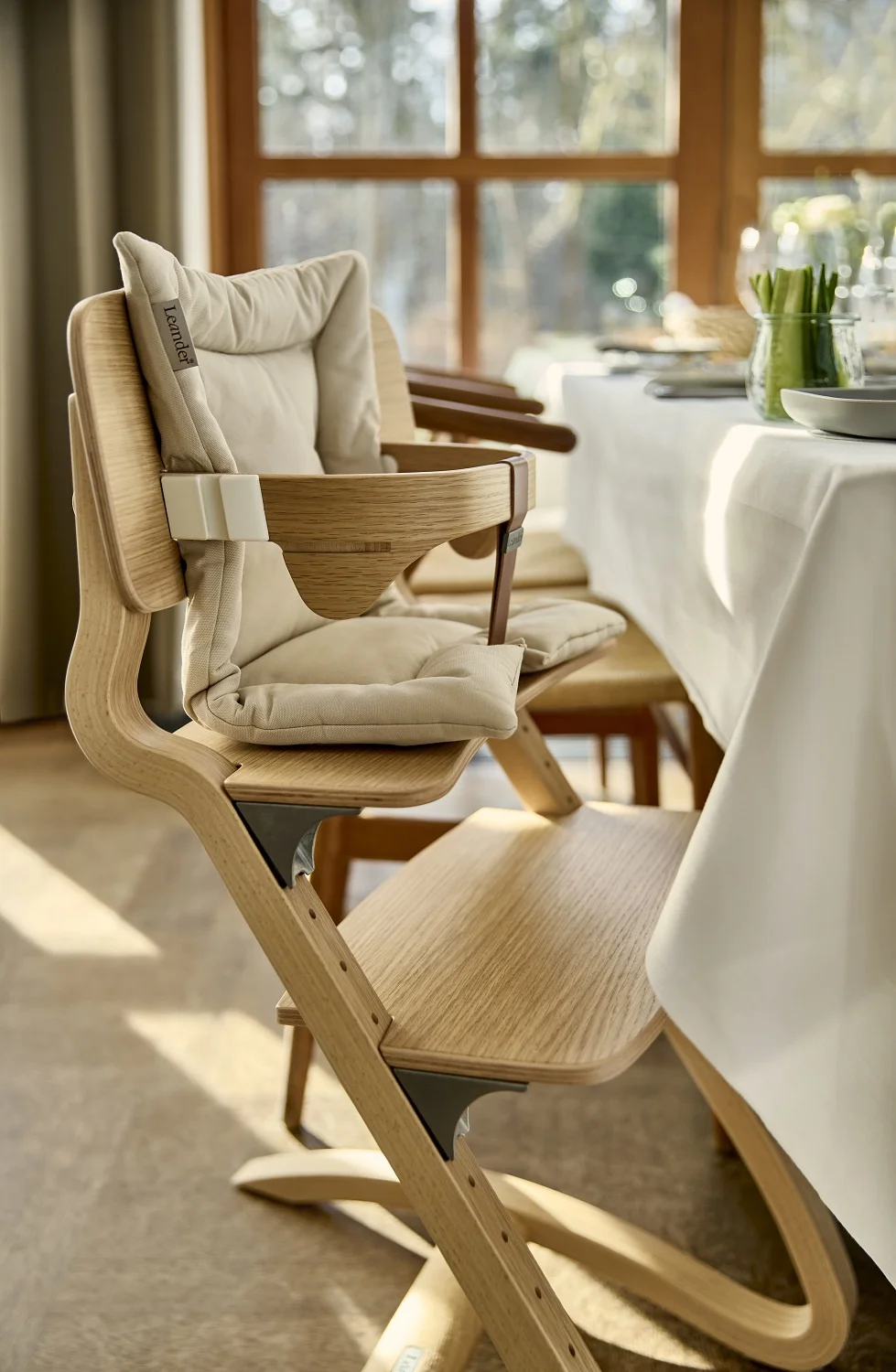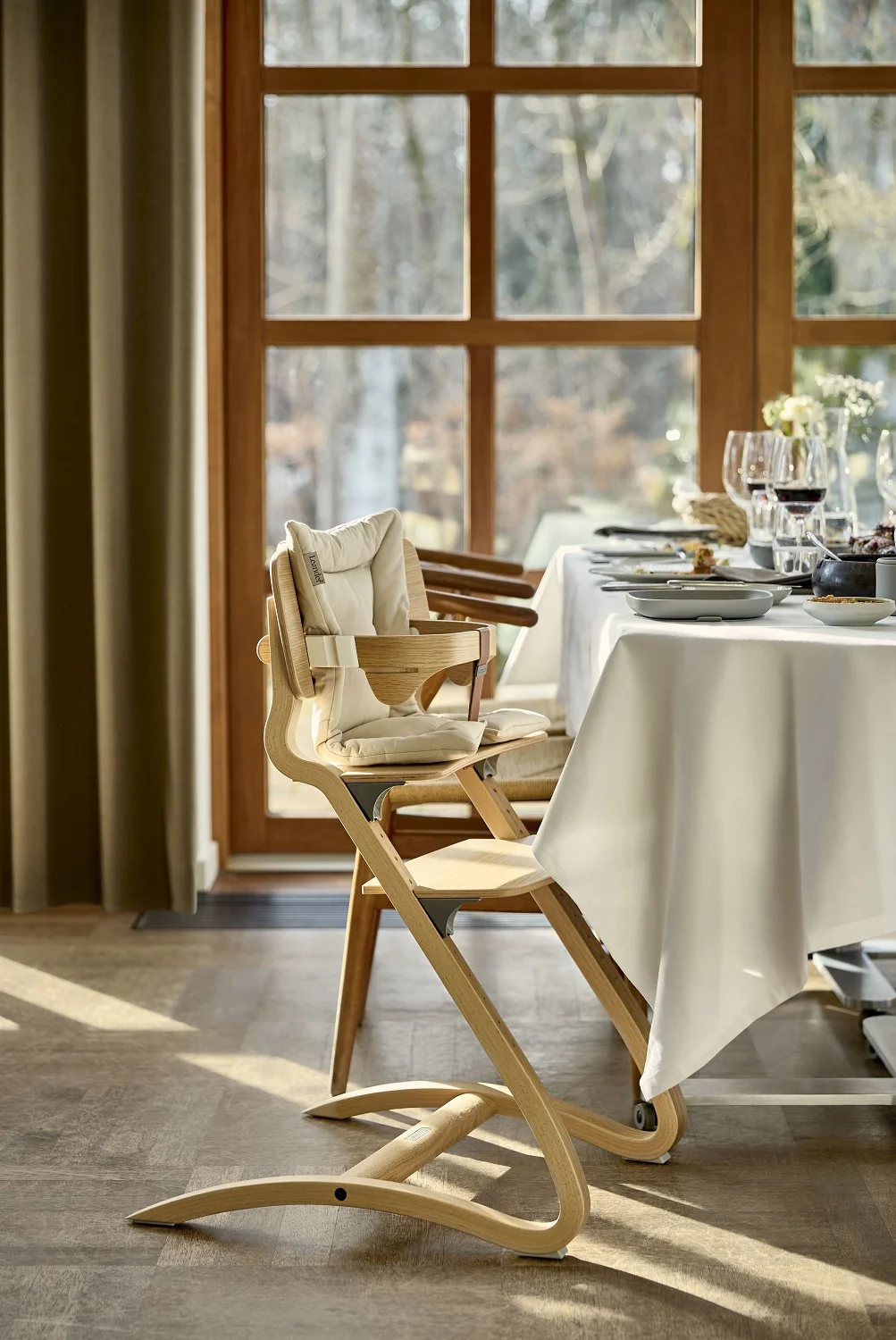 Kiedy Twoje dziecko jest w stanie usiąść prosto, czas na krzesełko do karmienia. Na początku maluch będzie potrzebował dodatkowego wsparcia w postaci poręczy zabezpieczającej. Aby Twoje dziecko miało zawsze najlepsze możliwe podparcie, poręcz krzesełka Leander Classic™ i Leander Louie™ można montować w dwóch pozycjach.