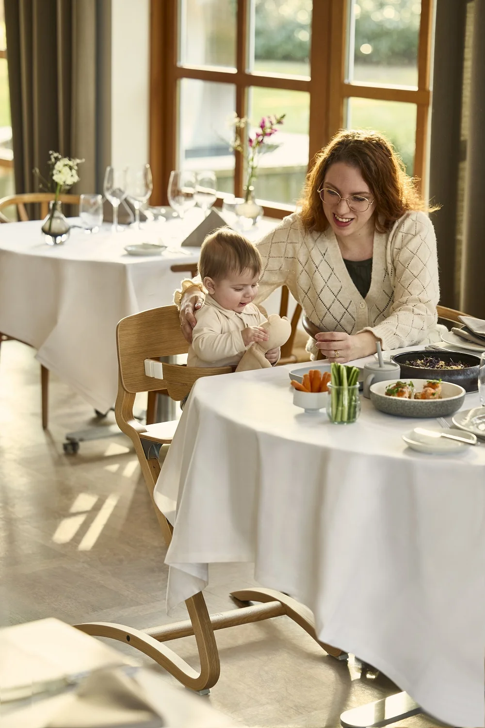 - Z krzesełkiem LEANDER maluch lub starszak może jeść posiłek z rodziną przy wspólnym stole