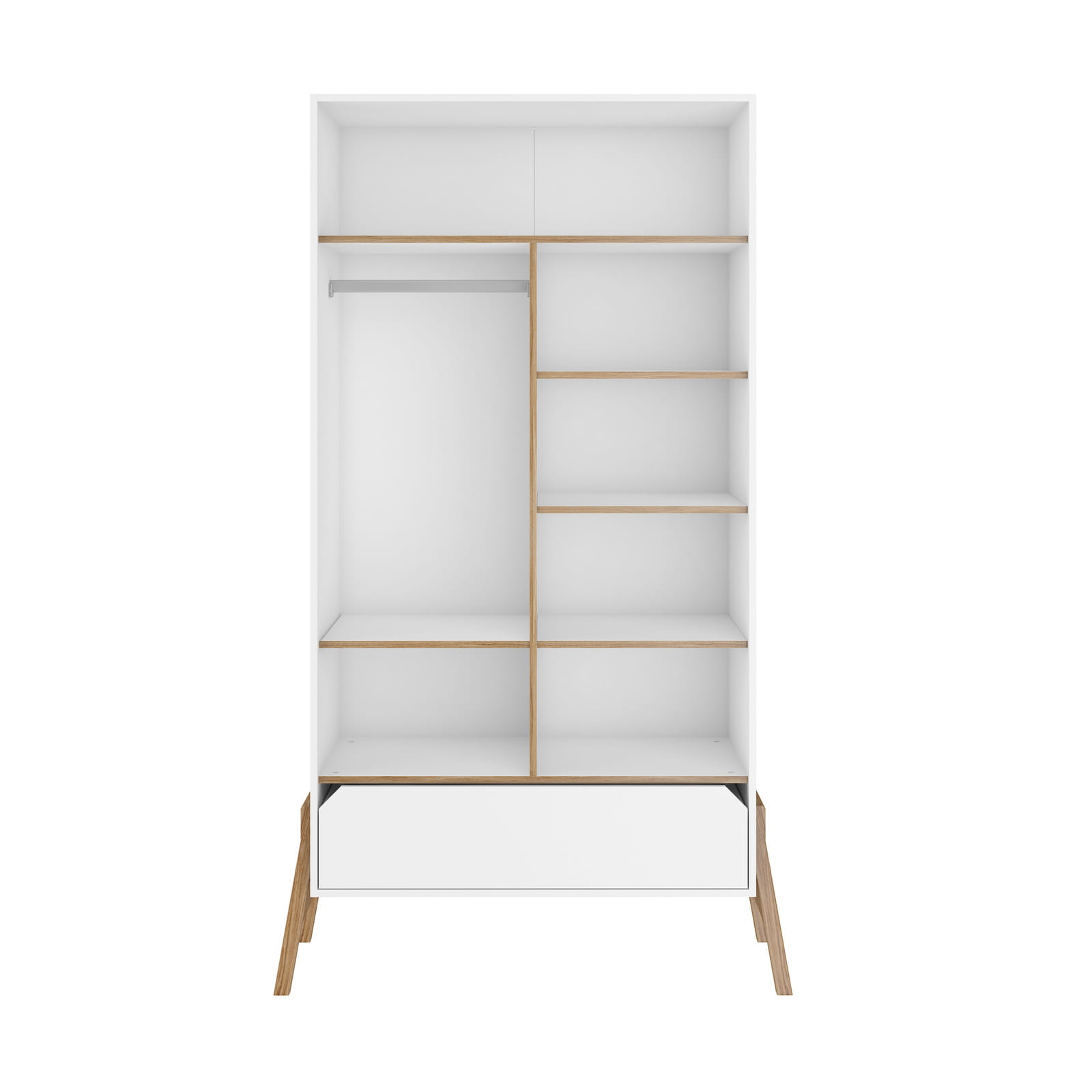 - wewnątrz 4 półki w tym 3 z możliwością regulacji położenia (prawa strona szafy); jedna półka na całej szerokości szafy; drążek wieszakowy, a pod nim jedna półka z możliwością regulacji położenia (lewa strona szafy),
