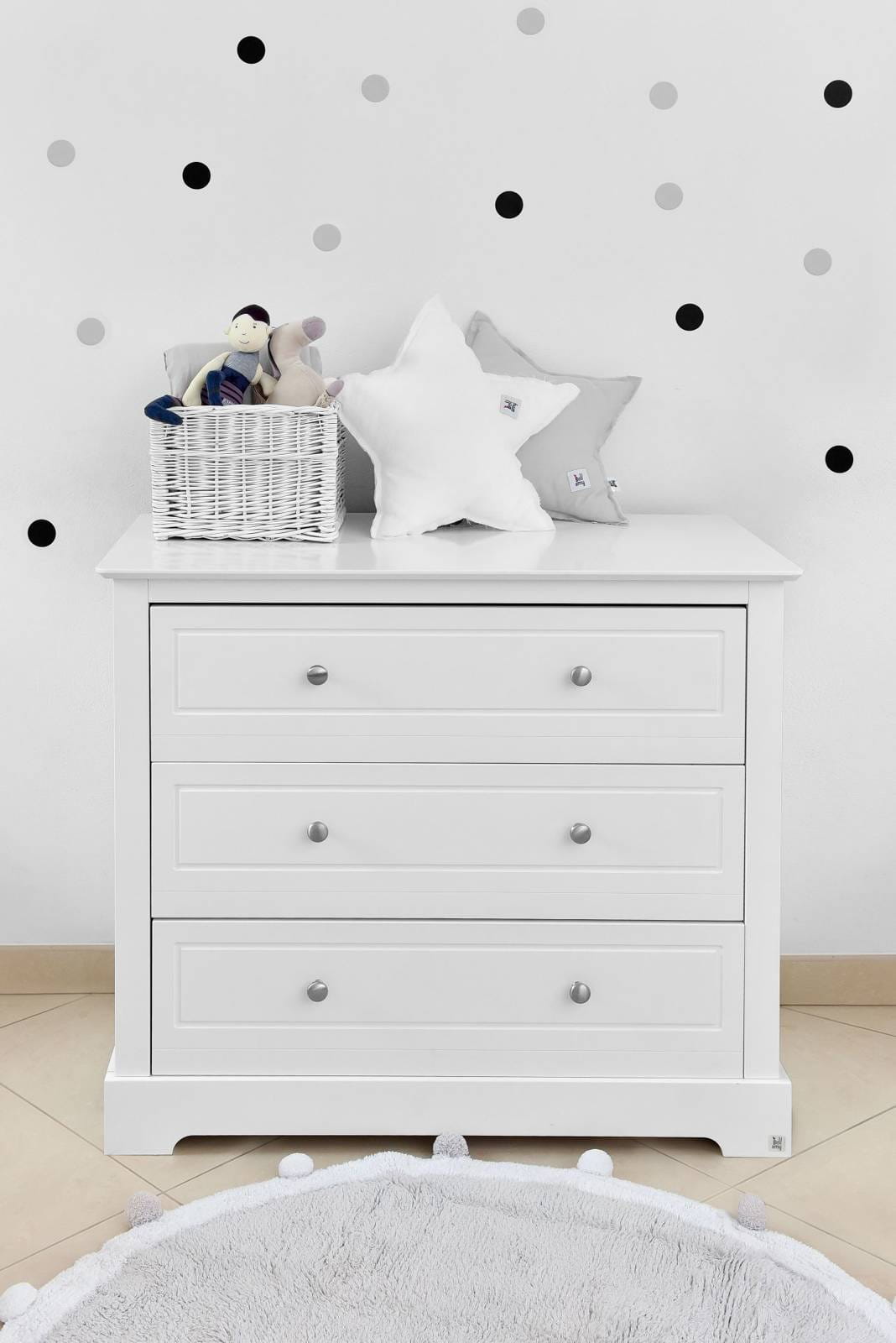 Komoda jest niezbędnym wyposażeniem każdego pokoju dziecięcego. To jeden z najbardziej uniwersalnych mebli, który doceni każda mama. Klasyczny i ponadczasowy wzór wpasuje się w każde wnętrze, natomiast głębokie i pojemne szuflady zdecydowanie ułatwią porządkowanie rzeczy.