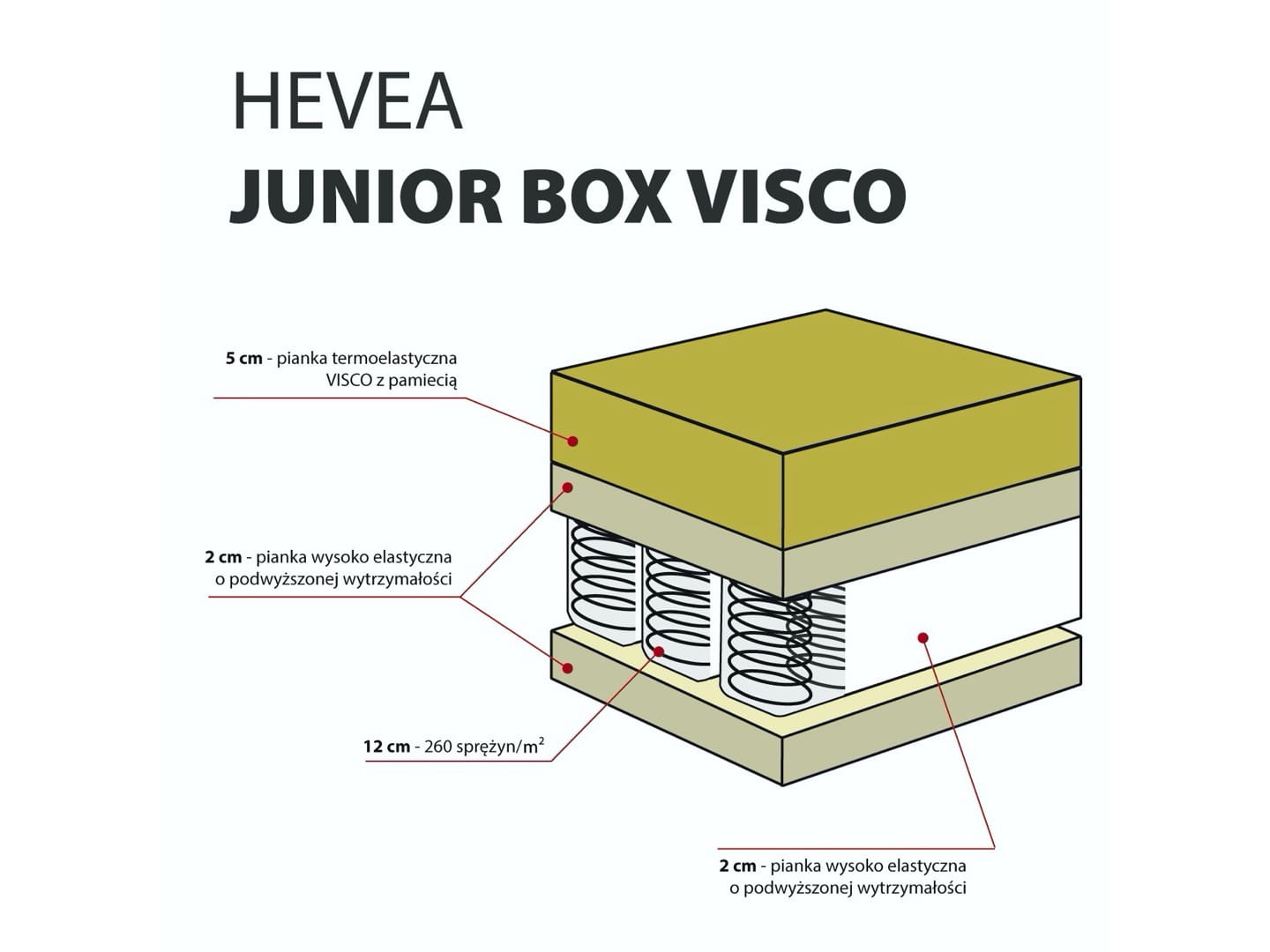 UWAGI: materac miękki/średnio-twardy, dwustronny, antyalergiczny. Brak możliwości wykonania rozmiarów nietypowych. Zalecany stelaż elastyczny, bez regulacji zagłówka i podnóżka lub szczebelkowy, zagęszczony o rozstawie szczebelków 3-5 cm. Materace Junior Box nie są rekomendowane do łóżek piętrowych na górny poziom, w przypadku barierki niższej niż 40°Cm.