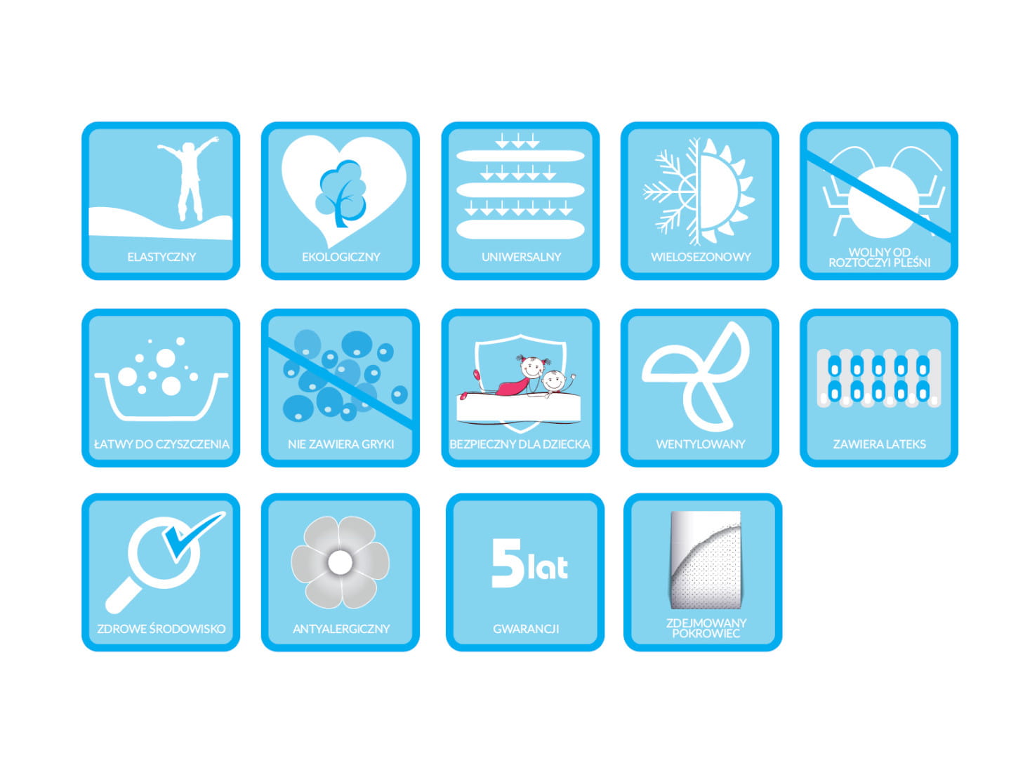 UWAGI: materac dwustronny, dwie strony użytkowe. Możliwość wykonania rozmiarów nietypowych. Warstwy materaca nie są klejone. Możliwość zmiany stron pianek celem wydłużenia okresu użytkowania produktu. Wymagany stelaż szczebelkowy płaski lub elastyczny o rozstawie szczebelków 3-5 cm. Możliwość wykonania niestandardowych rozmiarów w obrębie standardowej oferty.
