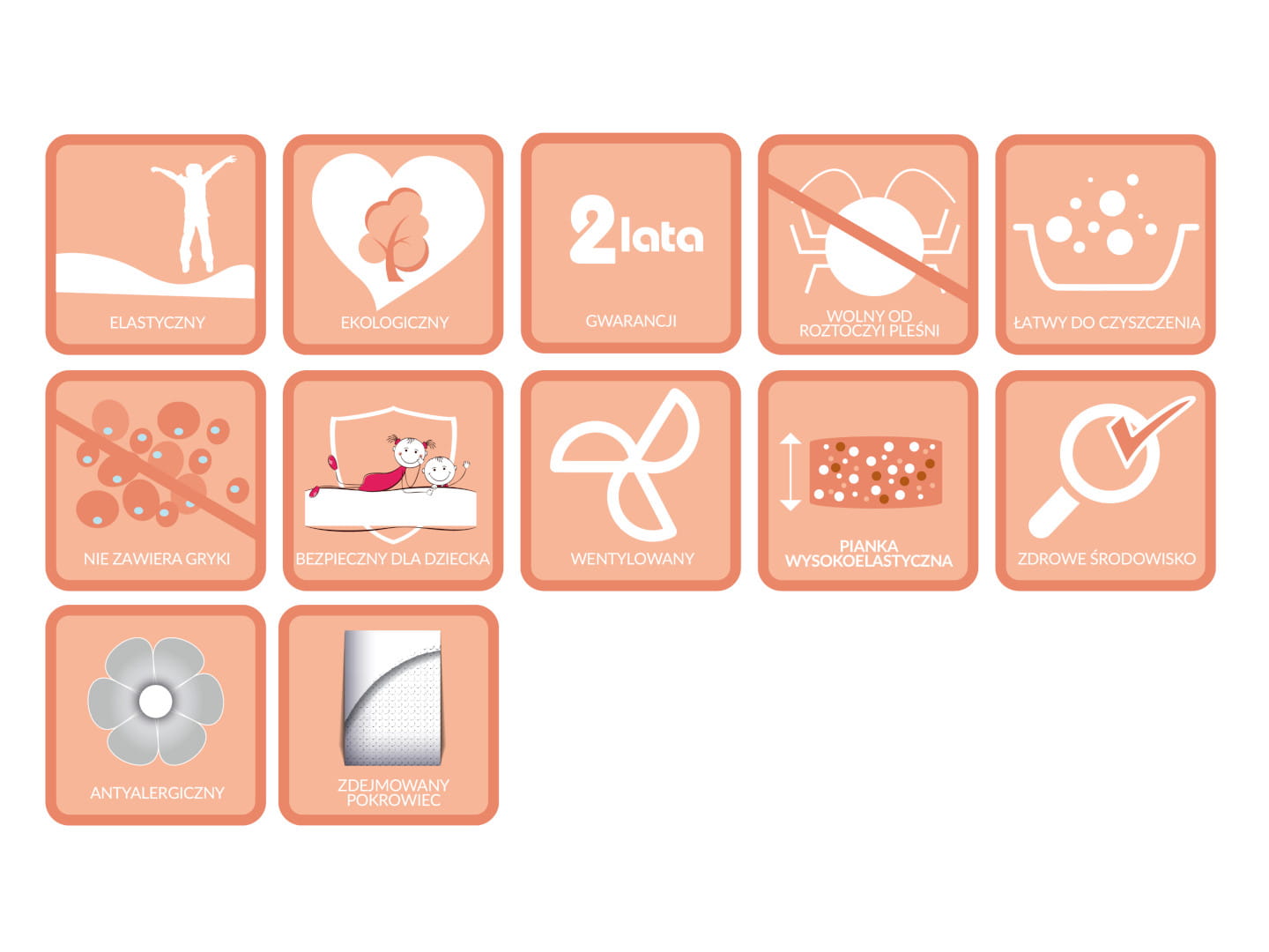 UWAGI: Materac twardy i średnio-twardy, dwustronny, dwie strony użytkowe. Strona gładka bezstrefowa dla dzieci mniejszych (2+) i strona 3 strefowa dla dzieci starszych o większej wadze. Możliwość wykonania rozmiarów nietypowych. Nie zginamy i nie rolujemy do transportu. Rekomendowany do każdego rodzaju stelaża. Kolor zastosowanego wkładu piankowego może się różnić od pokazanego na zdjęciu.