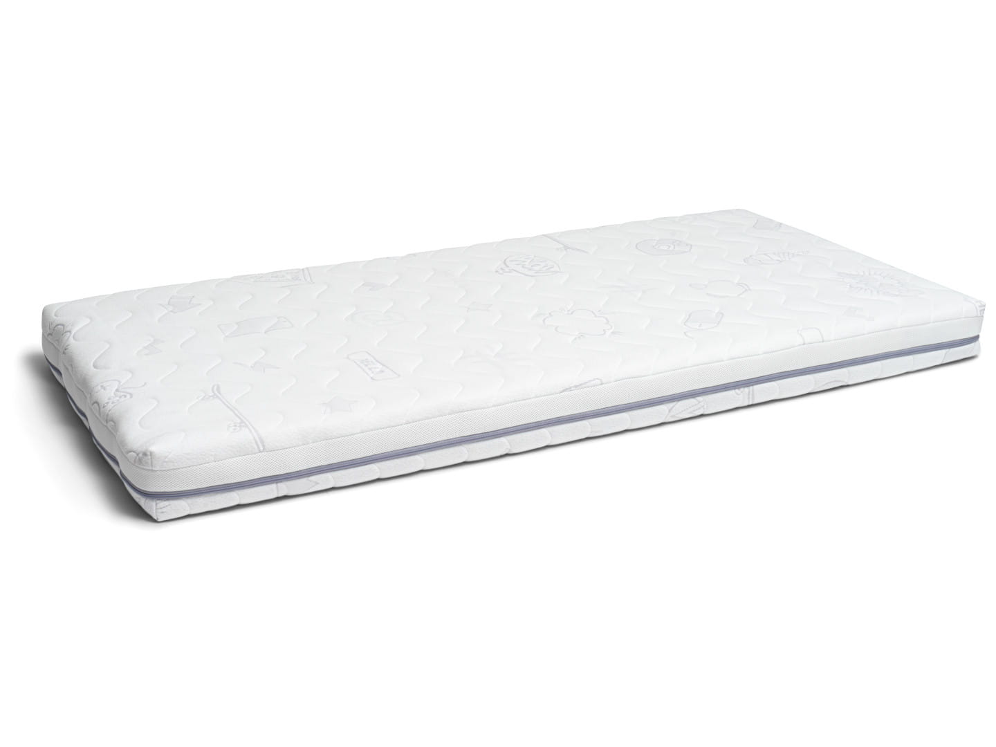 BUDOWA: Płyta z pianki wysoko elastycznej typu kaltschaum (HR) o dużej gęstości i dwóch różnych stronach użytkowych: 3 strefowej perforowanej i bezstrefowej. Wysokość wkładu 11 cm. Pokrowiec zewnętrzny z dzianiny pikowanej puszystą, antyalergiczną owatą 150 g. Innowacyjna, antyalergiczna dzianina bawełniana Hevea Graffiti dedykowana dla przedszkolaków i nastolatków, których rodzice szukają niebanalnych rozwiązań. Zawiera aż 34% bawełny. Posiada podwyższone parametry paroprzepuszczalności oraz zdolności neutralizacji wolnych rodników. Tonacja biała i szara, motywy rozpoznawalne przez dzieci. Zalecane pranie w temperaturze do 40°C. Certyfikat Oeko-Tex Standard 100. Wkład piankowy o dużej gęstości zapewnia trwałość produktu i dobre oparcie dla kręgosłupa. Pokrowiec wykończony taśmą suwakową z trzech stron w kolorze pastelowym szarym i białym klimabandem. Skład dzianiny – bawełna 36%/pe 66%. Waga materaca 5 kg (160/80 cm) - 9 kg (120/200). Wysokość materaca 12 cm.