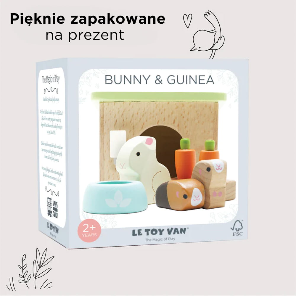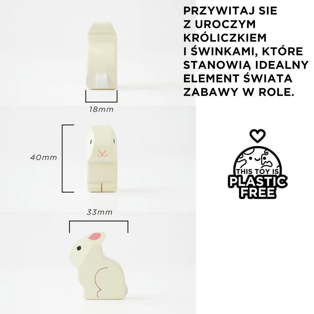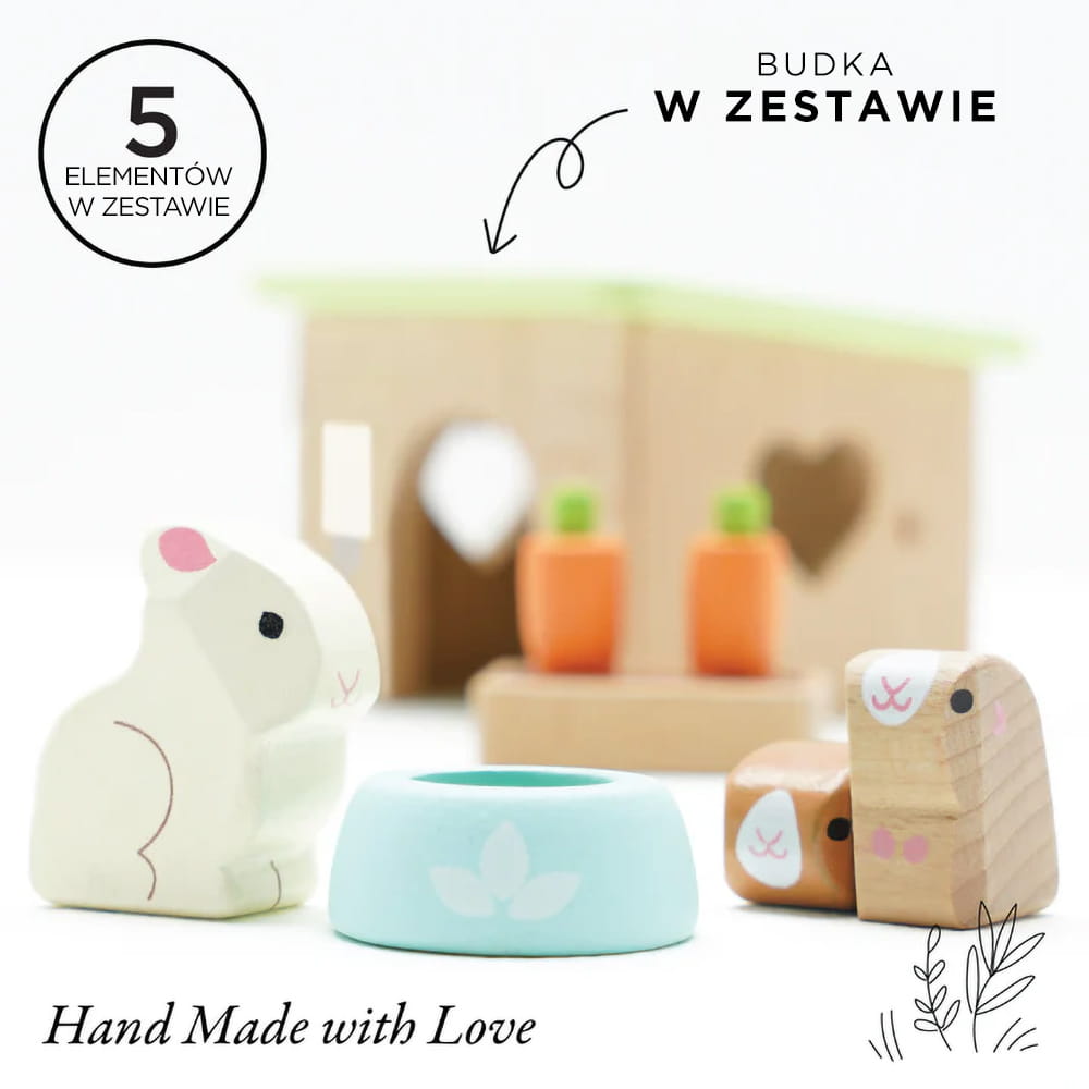 Dodaj trochę zwierzątek do domku lalek twoich maluchów dzięki temu uroczemu zestawowi z Króliczkiem i Świnkami Morskimi. Ta zabawka bez plastiku wykonana jest z naturalnego drewna certyfikowanego przez FSC®, pomalowana bezpiecznymi dla dzieci kolorami i składa się z 5 elementów do zabawy - króliczek, para świnek morskich, miska do karmienia, klatka i miejsce na marchewkę do chrupania. Słodki dodatek do kolekcji małego świata do zabawy.