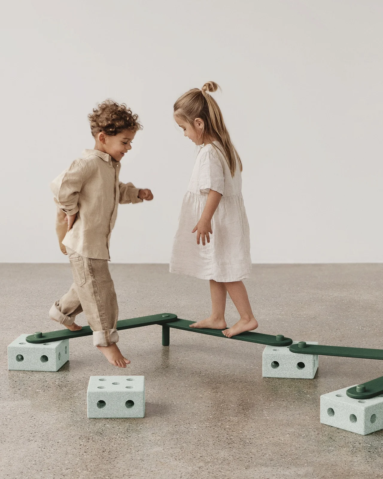 MODU - Balance Track to zestaw składający się z 4 klocków MODU - block square - sensoryczny blok piankowy, łączników i 4 desek balansujących.