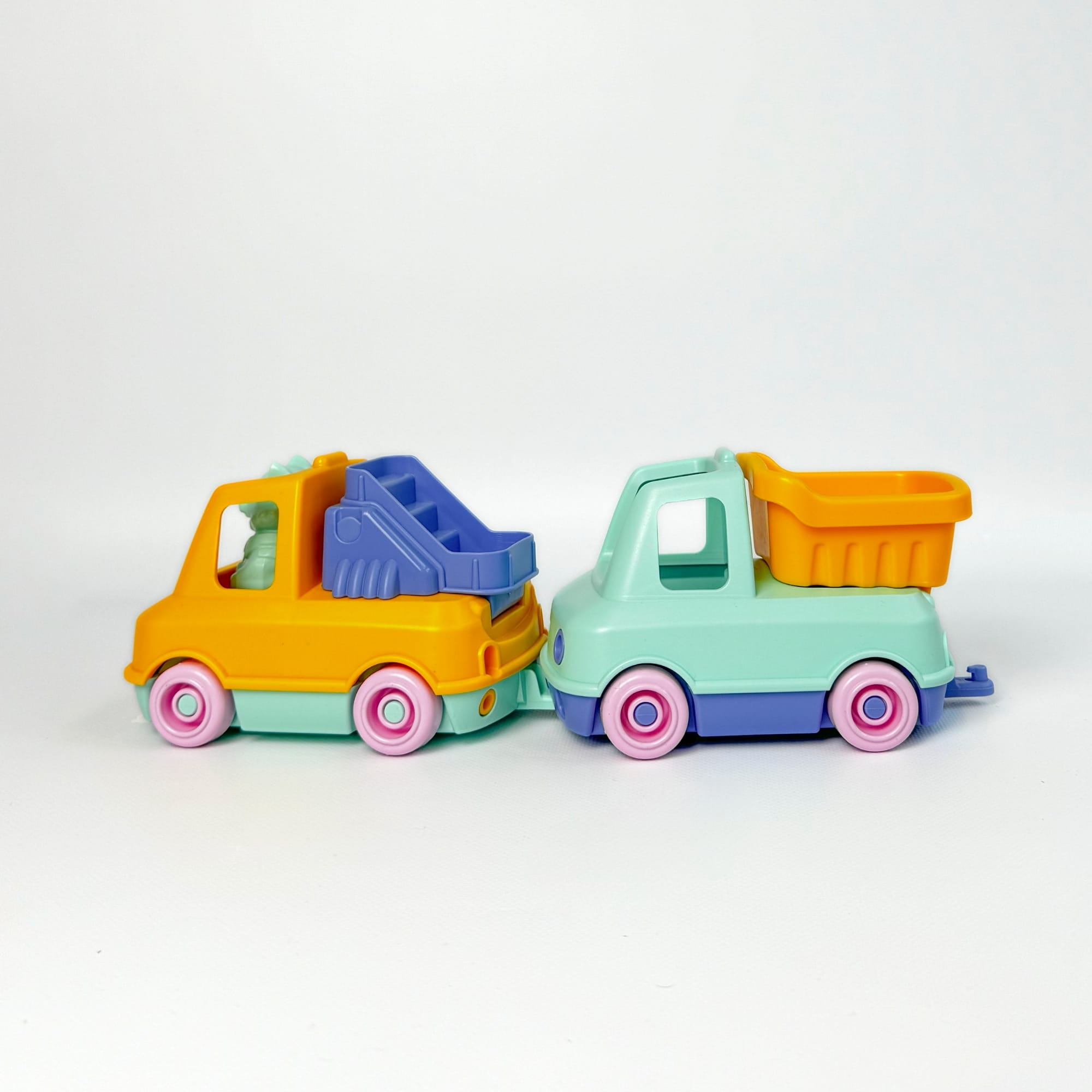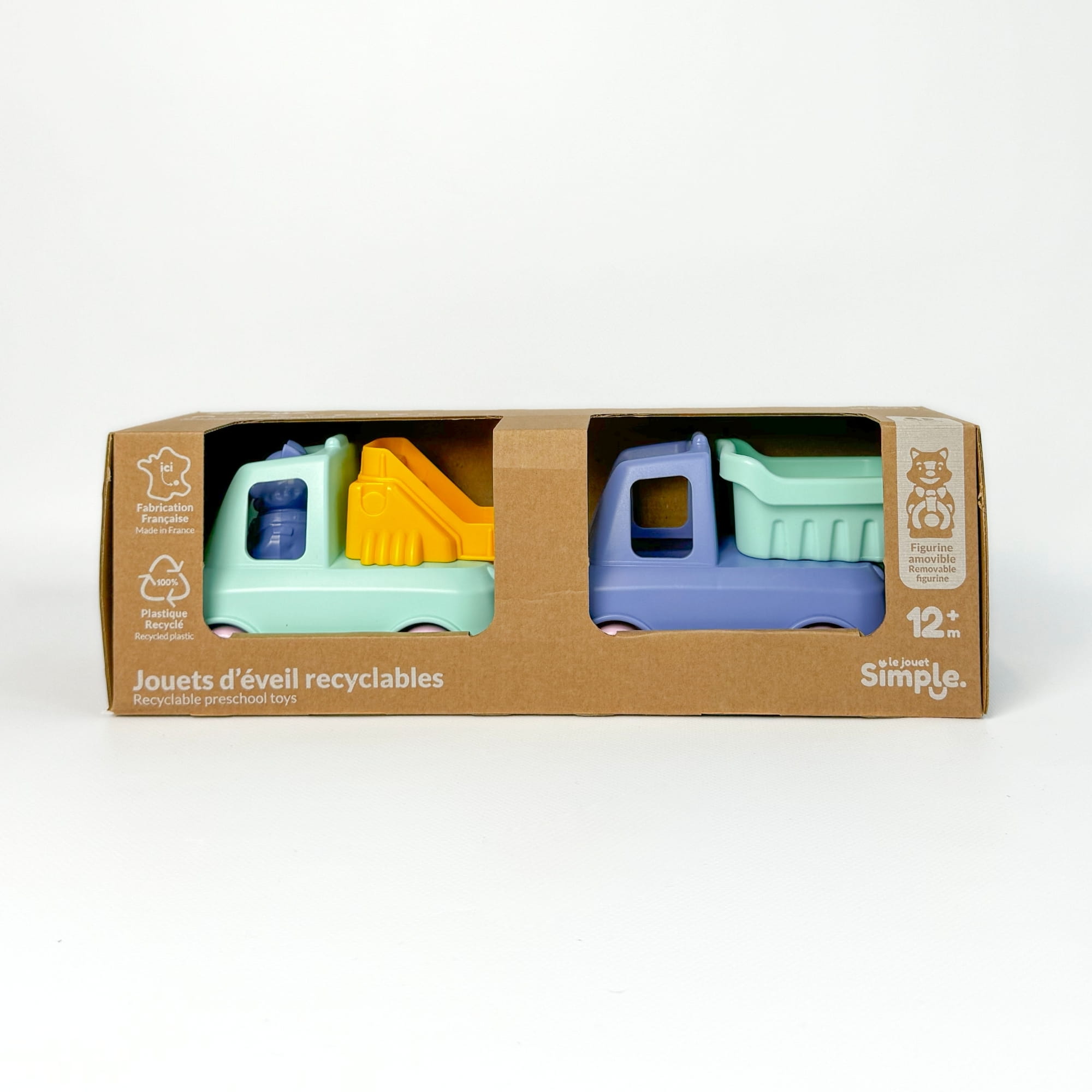 Zestaw Duo - Samochód strażacki + wywrotka wykonane we Francji z plastiku z recyklingu. Zestaw, który łączy ze sobą 2 kultowe samochody: samochód strażacki i wywrotkę, dwa kolorowe samochody, które jeżdżą wszędzie! Drabina straży pożarnej i wywrotka mogą być przechylane, aby odkryć małe schowki wewnątrz samochodów. Samochody można łączyć ze sobą, aby utworzyć mały pociąg.