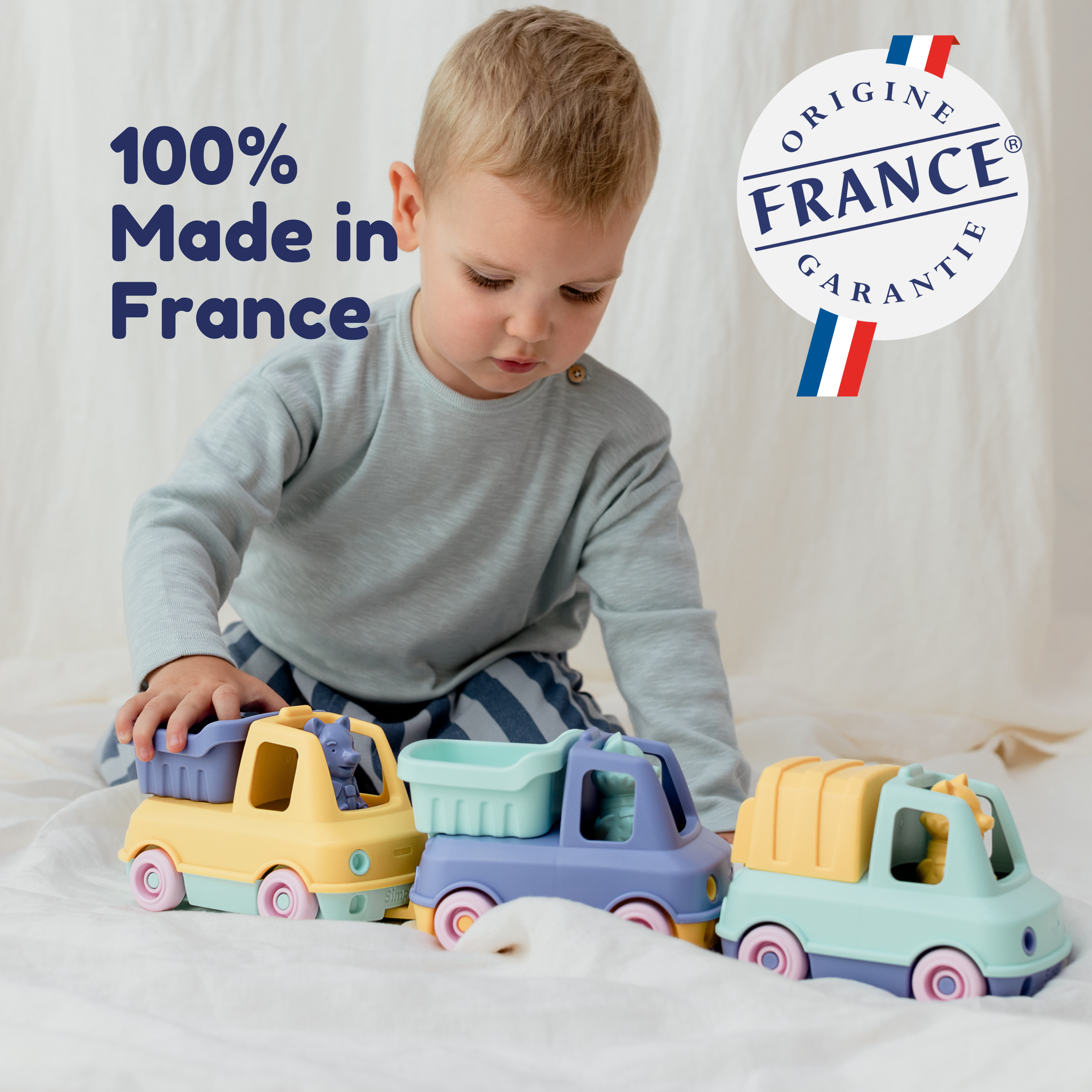Zestaw Duo - Samochód strażacki + Śmieciarka wykonane we Francji z plastiku z recyklingu. Zestaw, który łączy ze sobą 2 kultowe samochody: samochód strażacki i śmieciarkę, dwa kolorowe samochody, które jeżdżą wszędzie! Drabina straży pożarnej i tył śmieciarki mogą być przechylane, aby odkryć małe schowki wewnątrz samochodów. Samochody można łączyć ze sobą, aby utworzyć mały pociąg.