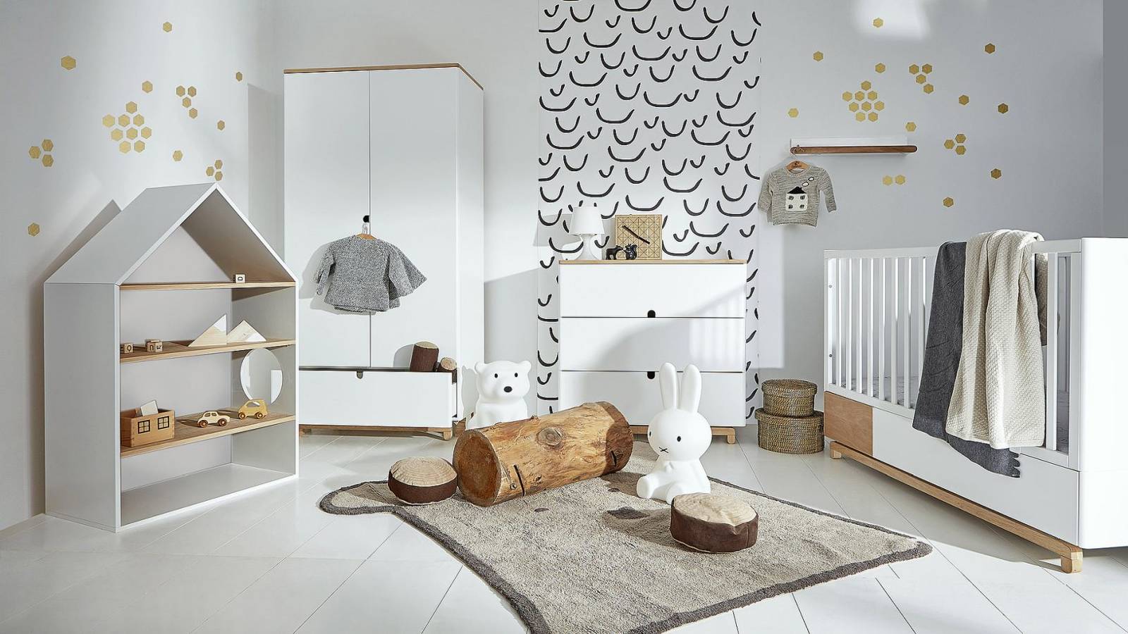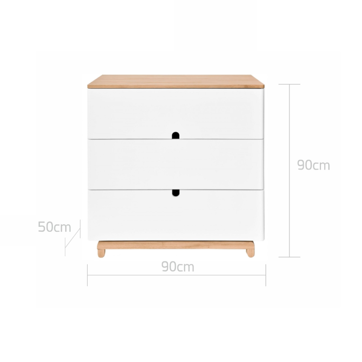 Komoda obok łóżeczka jest bardzo ważnym meblem w pokoju dziecięcym. Posiada obszerne szuflady, które pomieszczą mniejsze i większe ubranka, akcesoria oraz zabawki. Zamiast tradycyjnych uchwytów zastosowaliśmy wycięcia w kształcie półkoli, które będą przyjazne do otwierania tak dla dzieci jak i dorosłych. Bardzo praktycznym rozwiązaniem jest również możliwość zamontowania na blacie komody przewijaka, aby umożliwić rodzicom bezpiecznie przewijanie i pielęgnację dziecka w okresie wczesnego dzieciństwa.