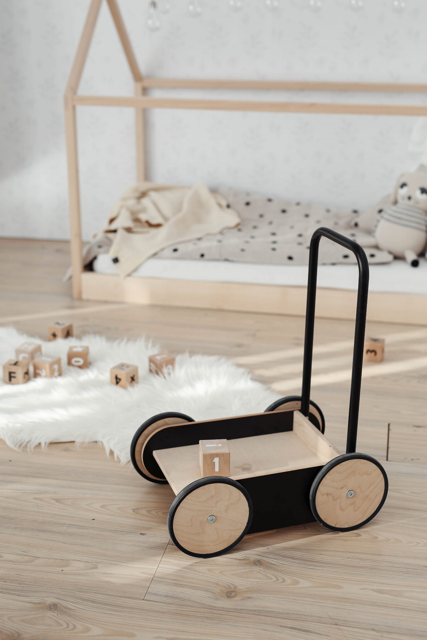 - Stabilna konstrukcja: Chodzik wykonany jest z drewna i metalu, co zapewnia jego trwałość i stabilność, wspierając maluchy w nauce chodzenia.
