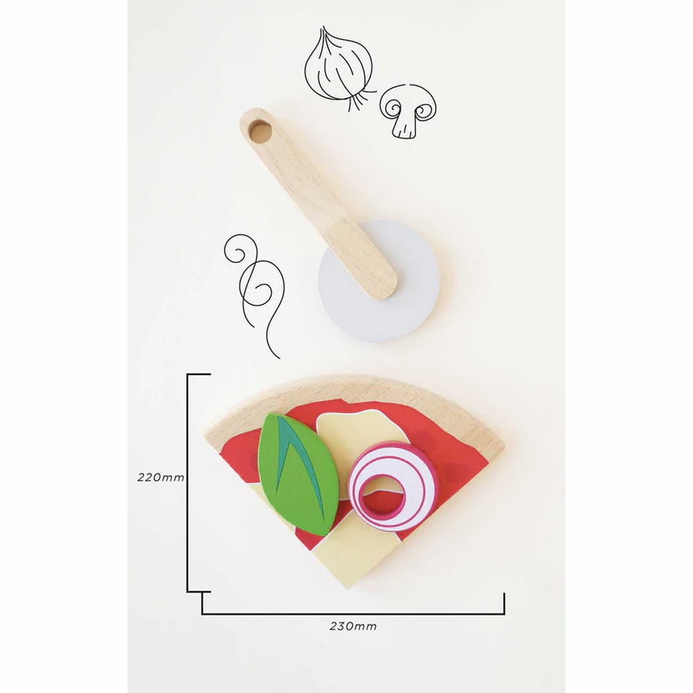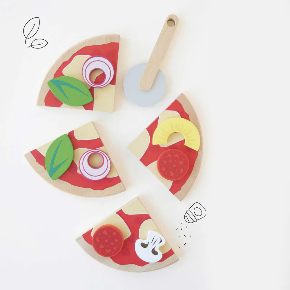 Mali kucharze zajmą się dekorowaniem własnej pizzy, z odłączalnymi składnikami przypinanymi na rzepy i praktycznym nożem do pizzy. Wszystko w opakowaniu w formie pudełka do pizzy, stworzonym do realistycznej zabawy. Ucz dzieci różnych grupach żywności i zachęcaj do zdrowego jedzenia poprzez zabawę.