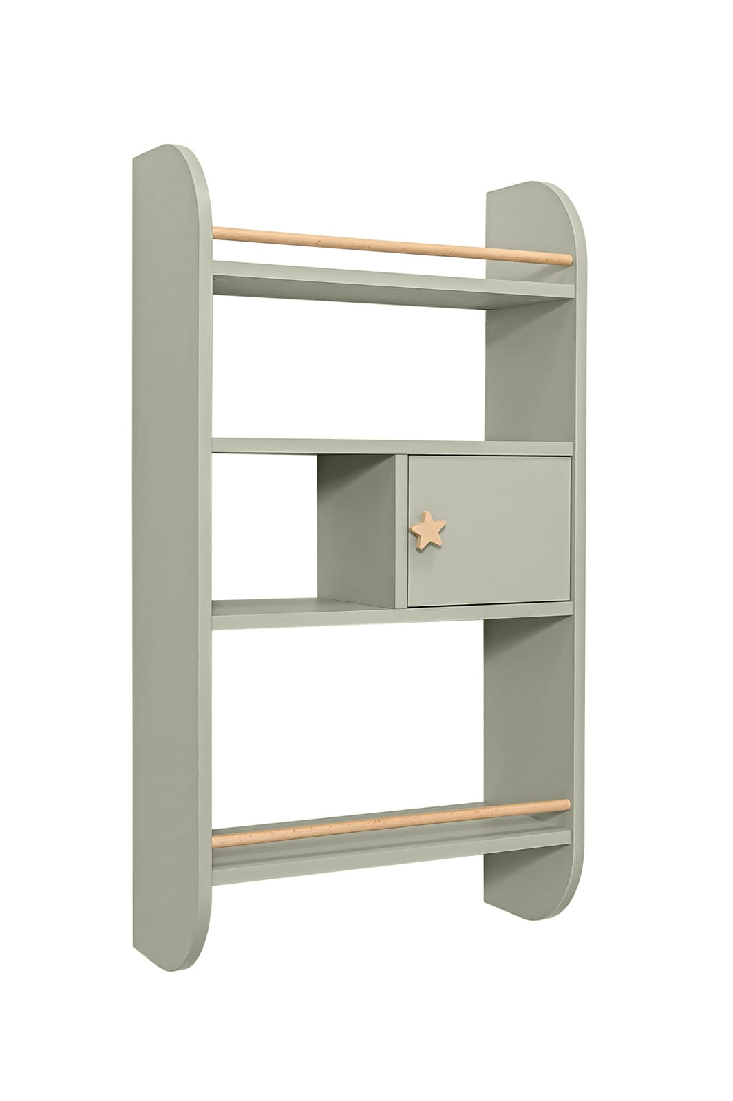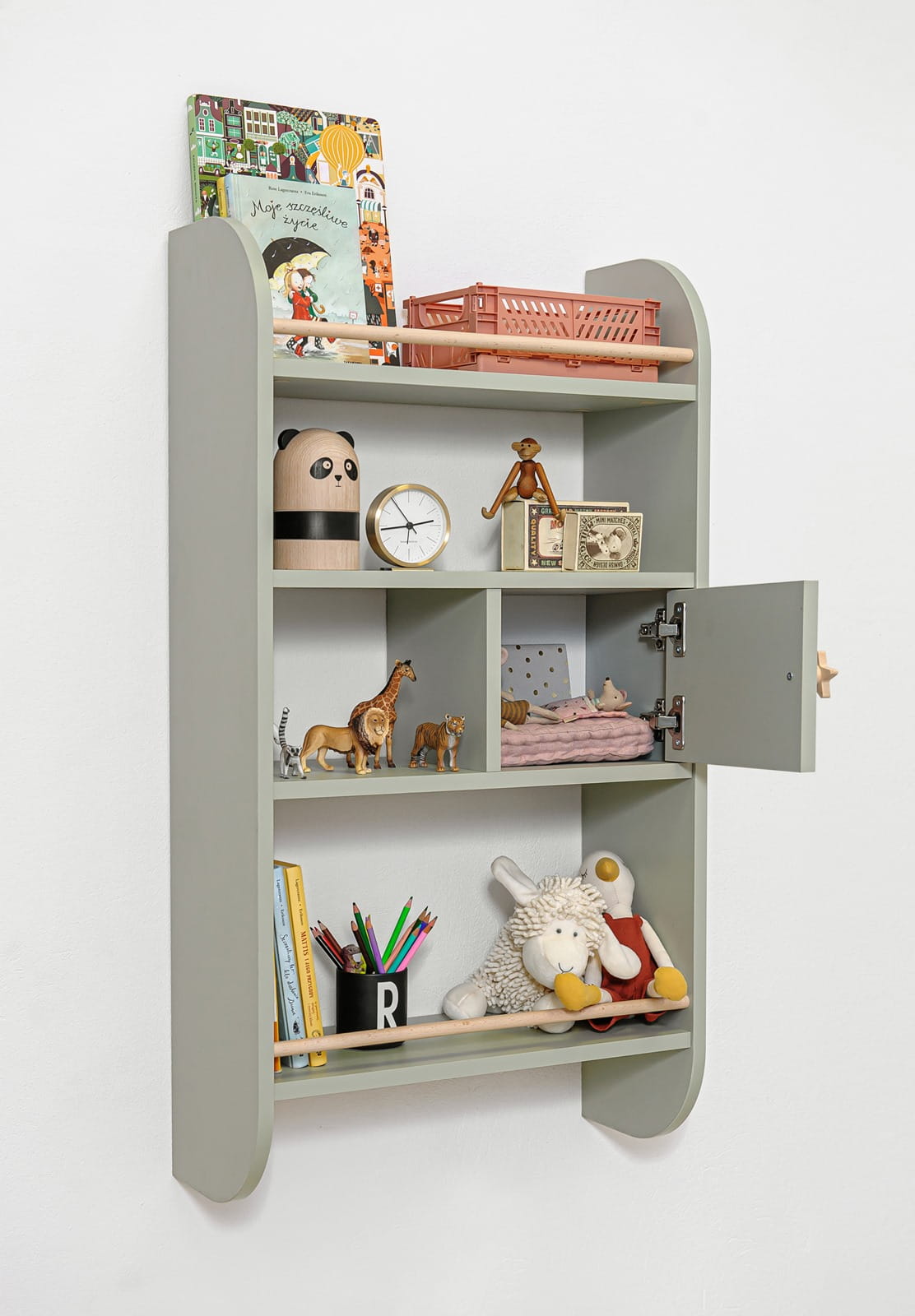 Półka z kolekcji Rainbow jest idealnie dostosowana do potrzeb zarówno najmniejszych jak i starszych dzieci. Wyposażona została w szafeczkę oraz trzy półeczki przez co jest bardzo funkcjonalna oraz pojemna. Może zostać zamontowana, nad biurkiem, łóżkiem oraz nisko przy podłodze umożliwiając swobodny dostęp do książeczek, zabawek i innych bibelotów. Dwie półki zakończone są drewnianym ogranicznikiem, który dodatkowo zabezpiecza książki przed wypadaniem.