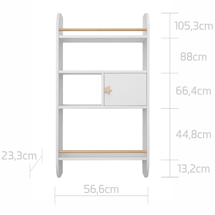 Półka z kolekcji Rainbow jest idealnie dostosowana do potrzeb zarówno najmniejszych jak i starszych dzieci. Wyposażona została w szafeczkę oraz trzy półeczki przez co jest bardzo funkcjonalna oraz pojemna. Może zostać zamontowana, nad biurkiem, łóżkiem oraz nisko przy podłodze umożliwiając swobodny dostęp do książeczek, zabawek i innych bibelotów. Dwie półki zakończone są drewnianym ogranicznikiem, który dodatkowo zabezpiecza książki przed wypadaniem.