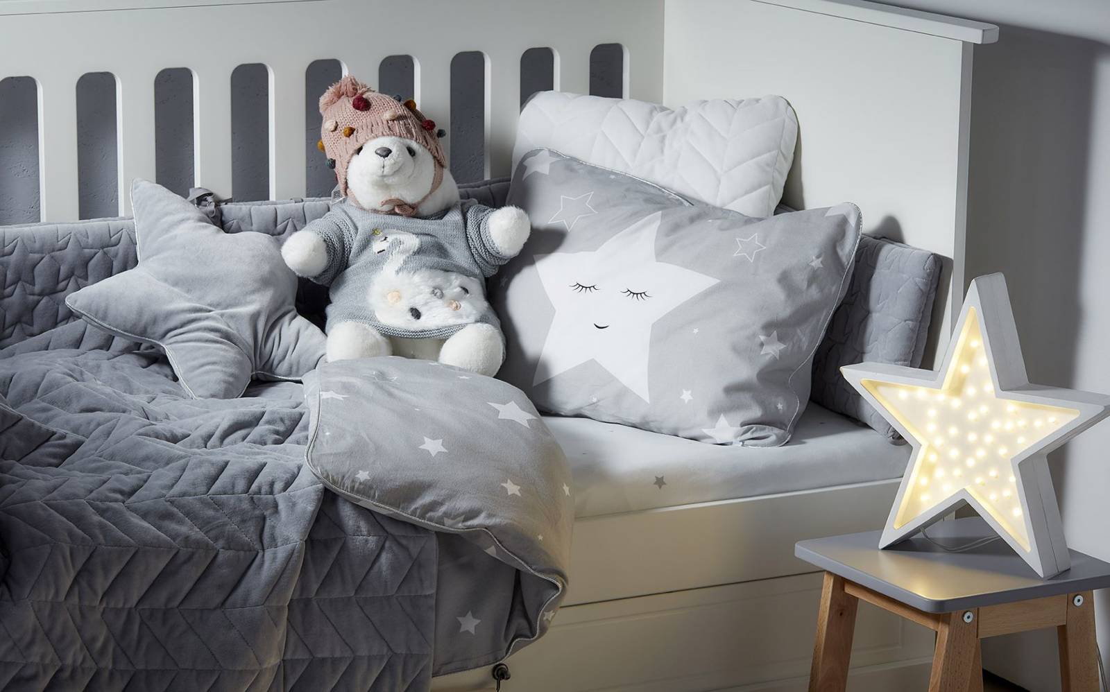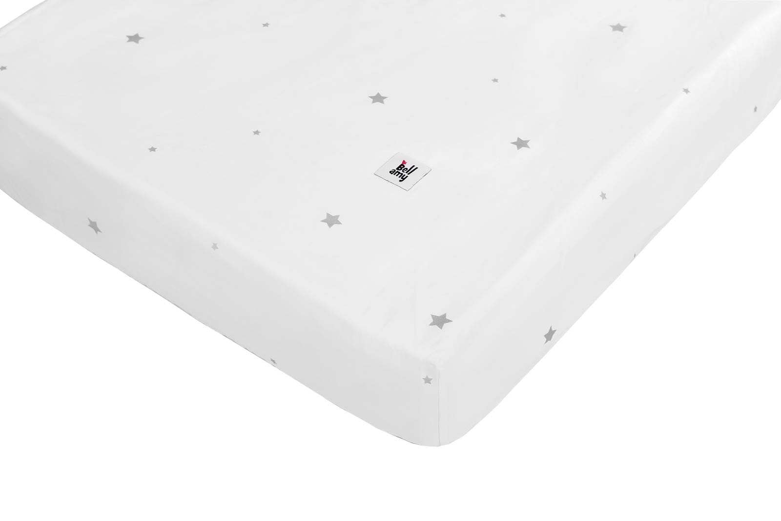Prześcieradło na gumce z wysokogatunkowej bawełny w kolorze białym z motywem szarych gwiazdek.